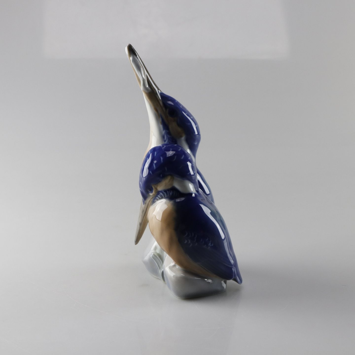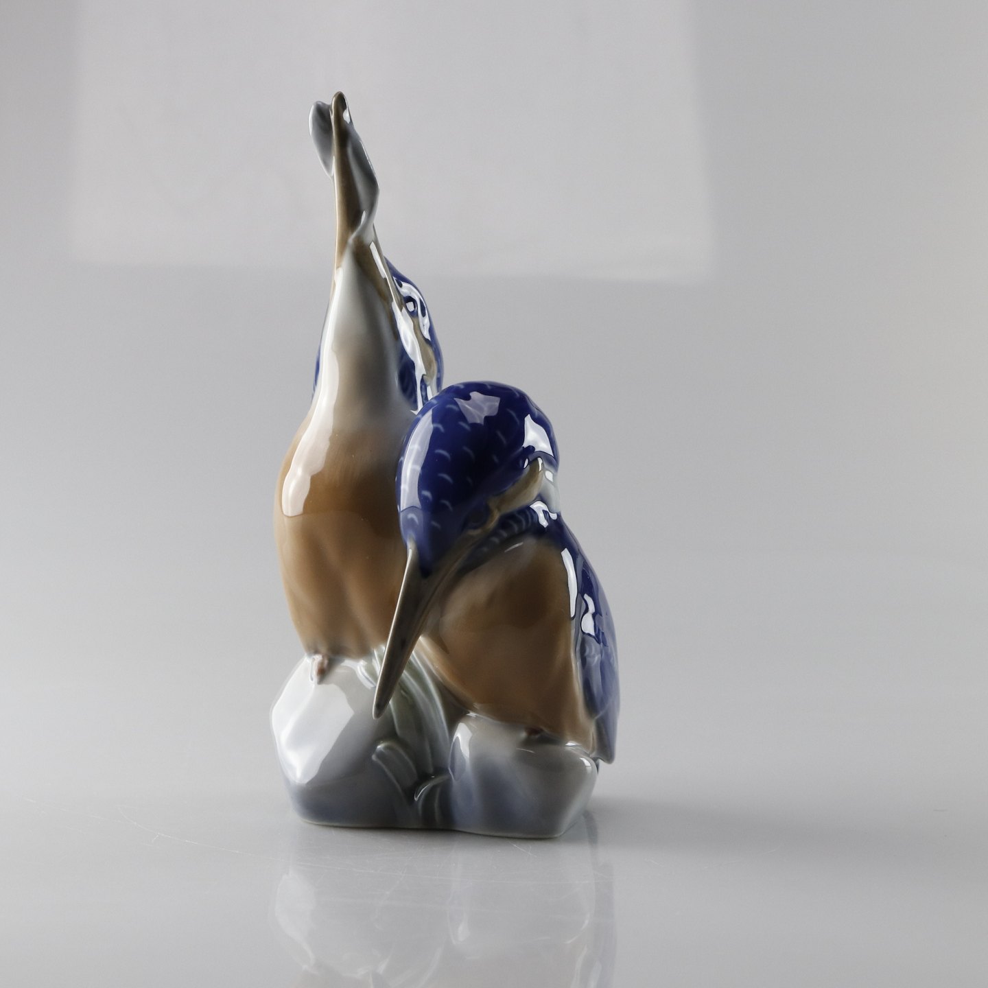 Figur i porcelæn af to isfugle i blålige farver