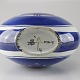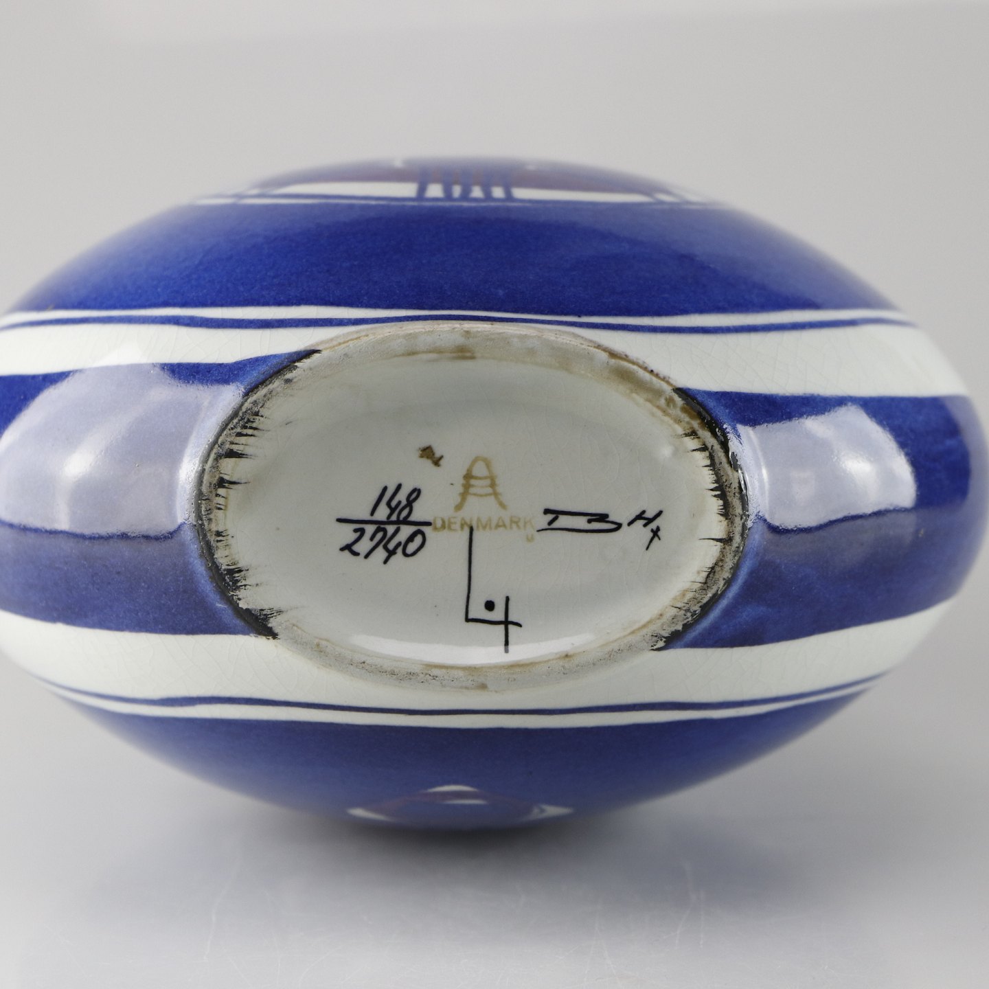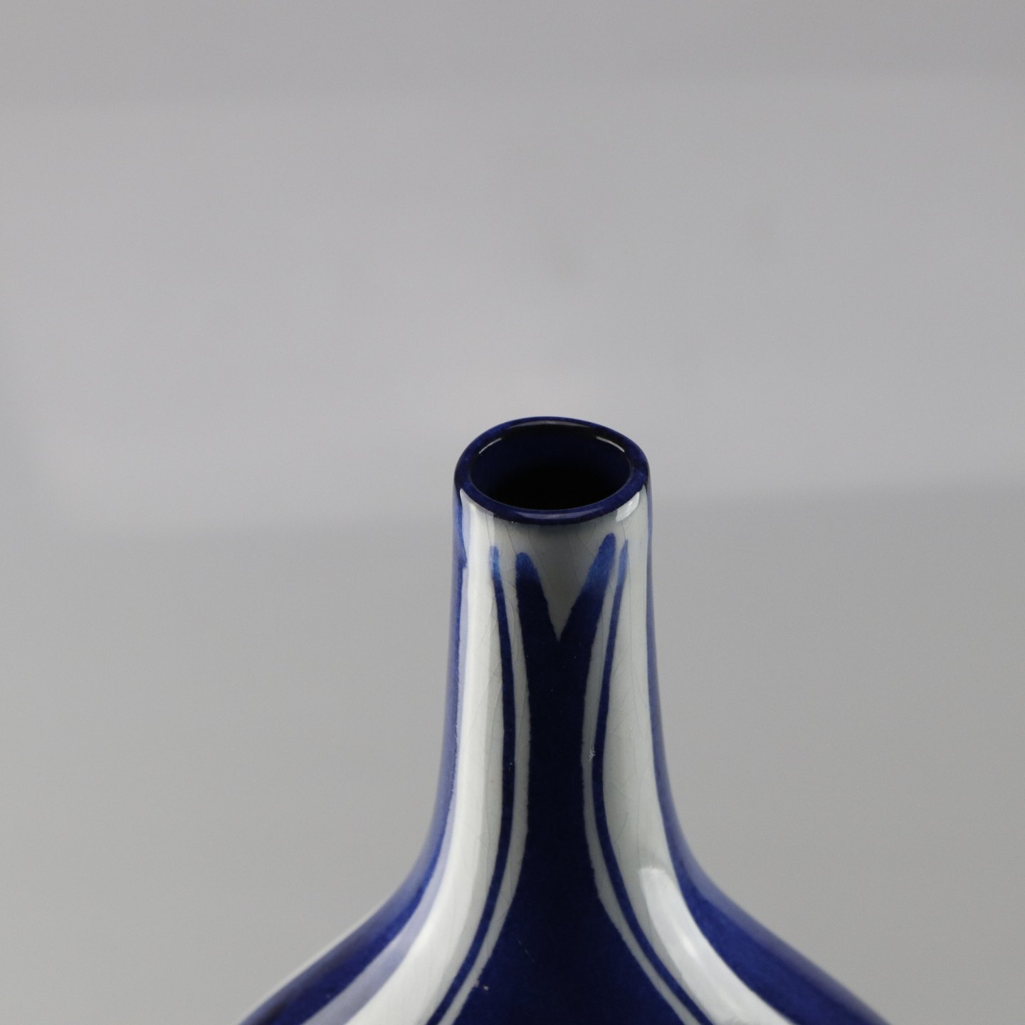 Vase med smal åbning i blå glasur dekoreret med ringe og streger