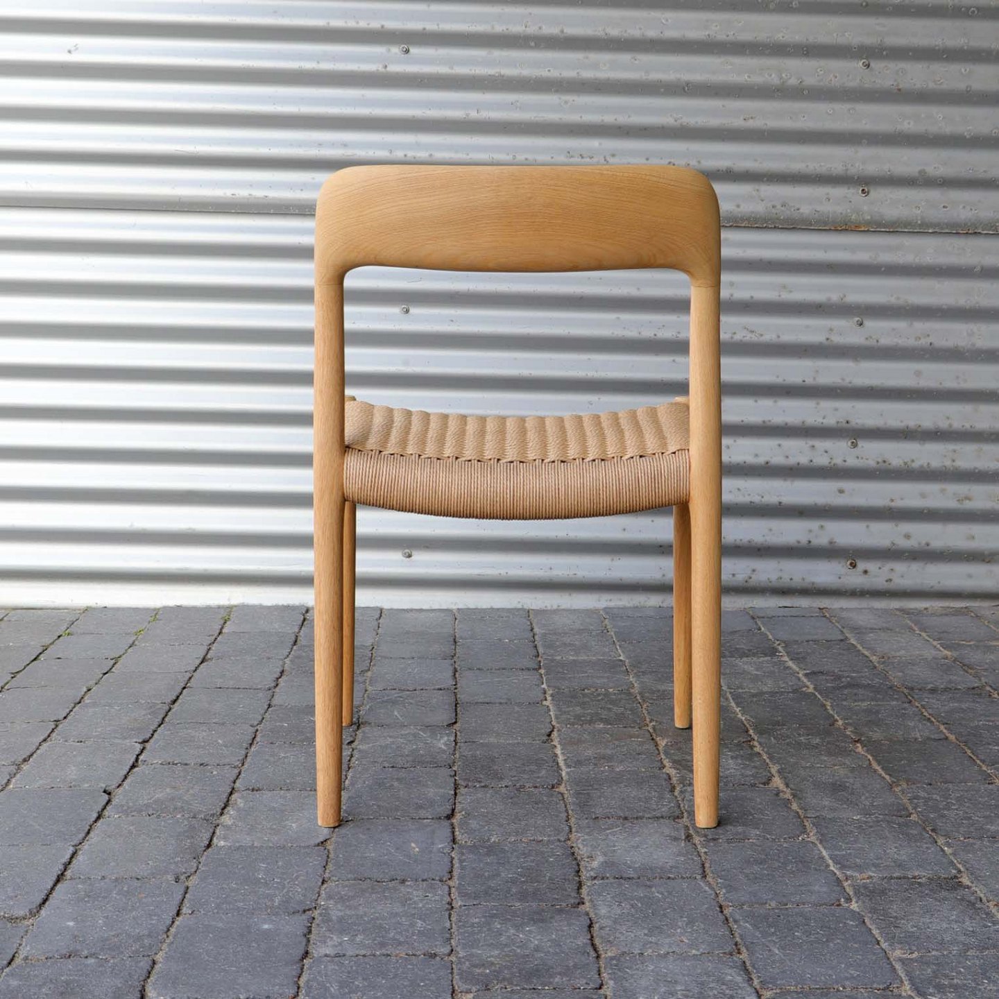Et styk spisebordsstole model 75 i sæbehandlet eg med nye sæder i papirgarnsflet