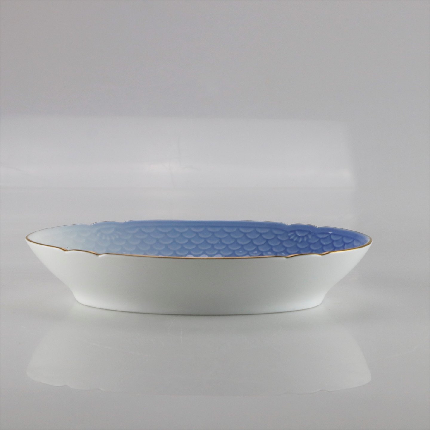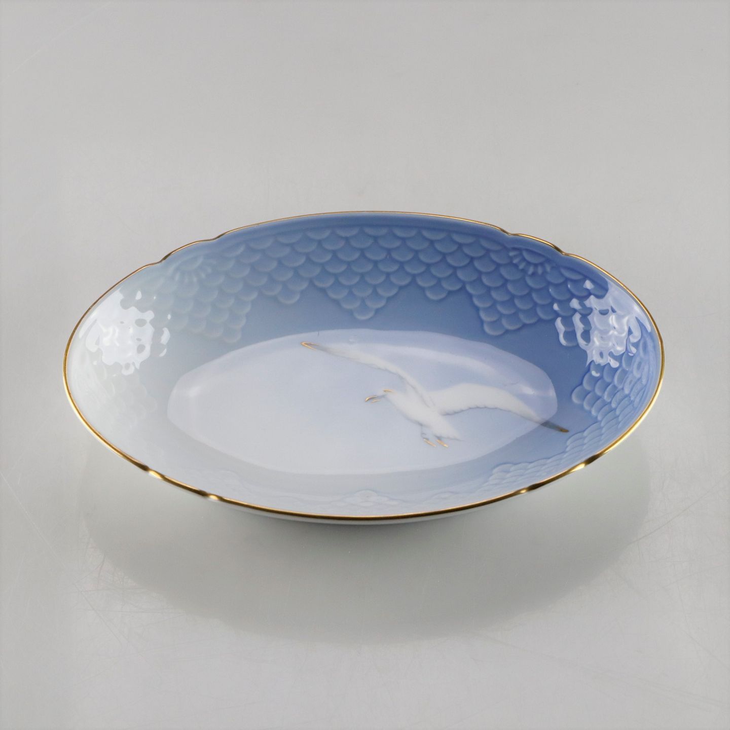Porcelænsskål i hvid og gradueret blå nuancer med guldkant og dekoration af måge