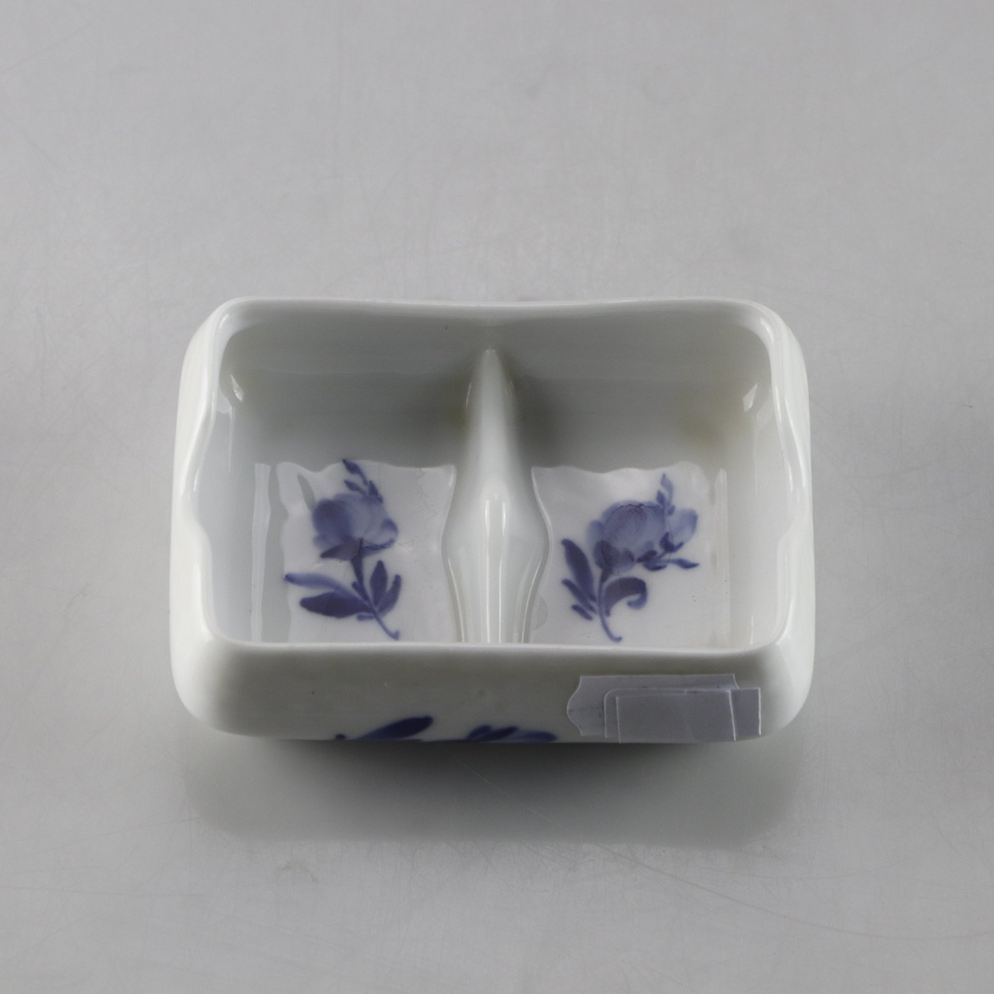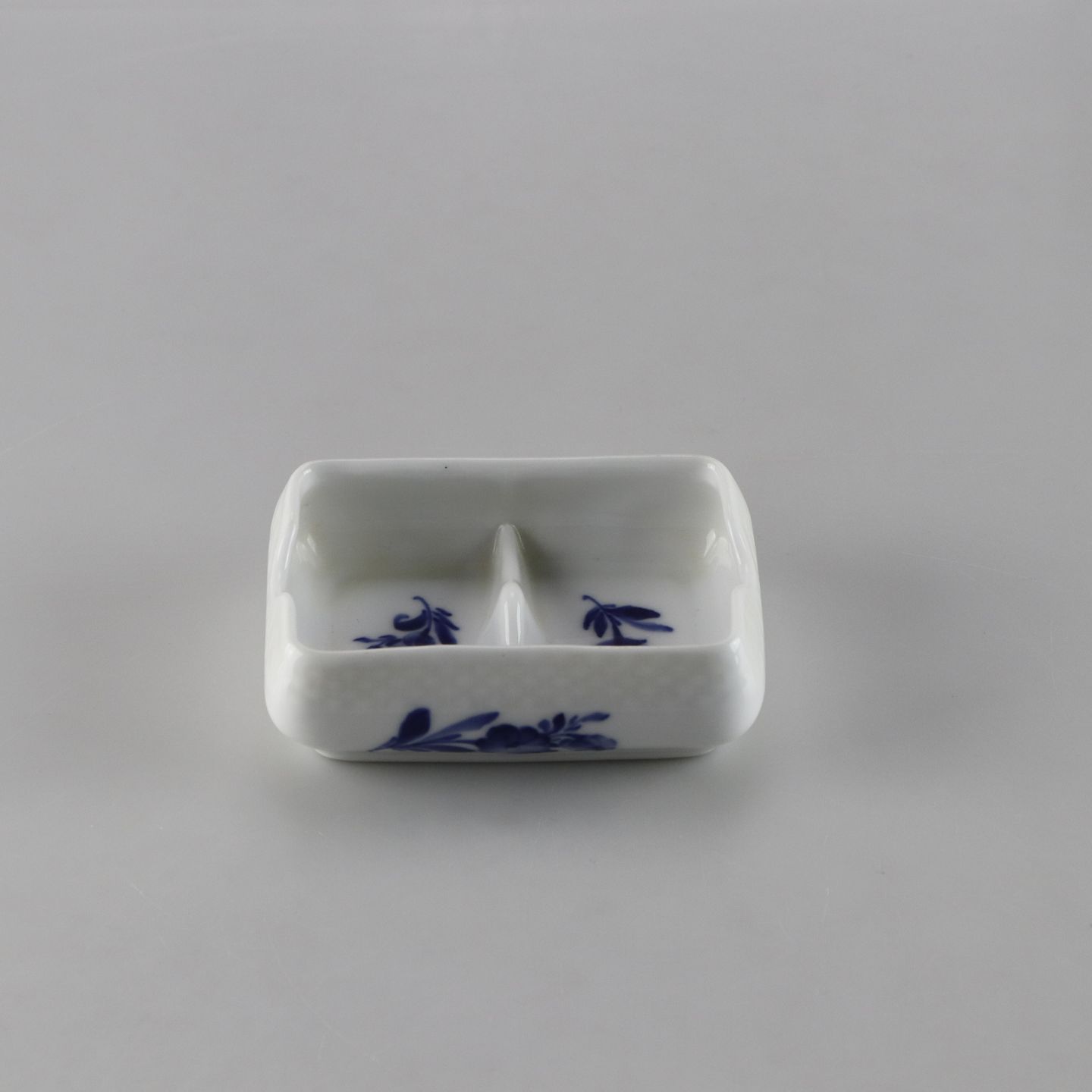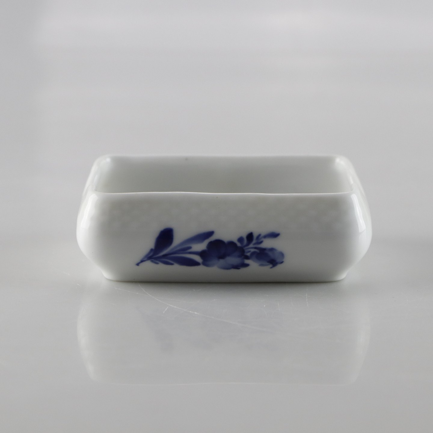 Rektangulær askeskål i glat hvidt porcelæn med flettet kant og dekoreret med blå blomster