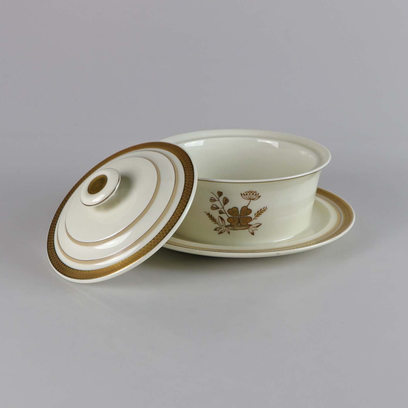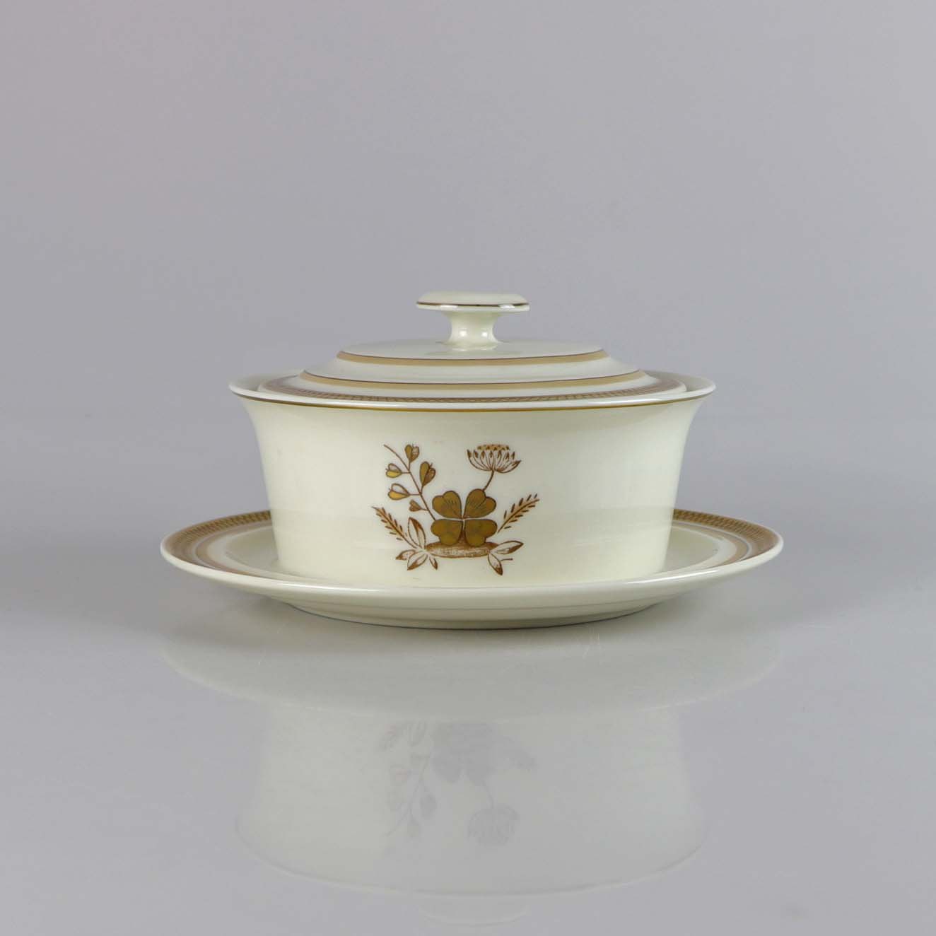 Cremefarvet porcelæn med motiv af gylden kløverblomst og bred graveret guldkantkant