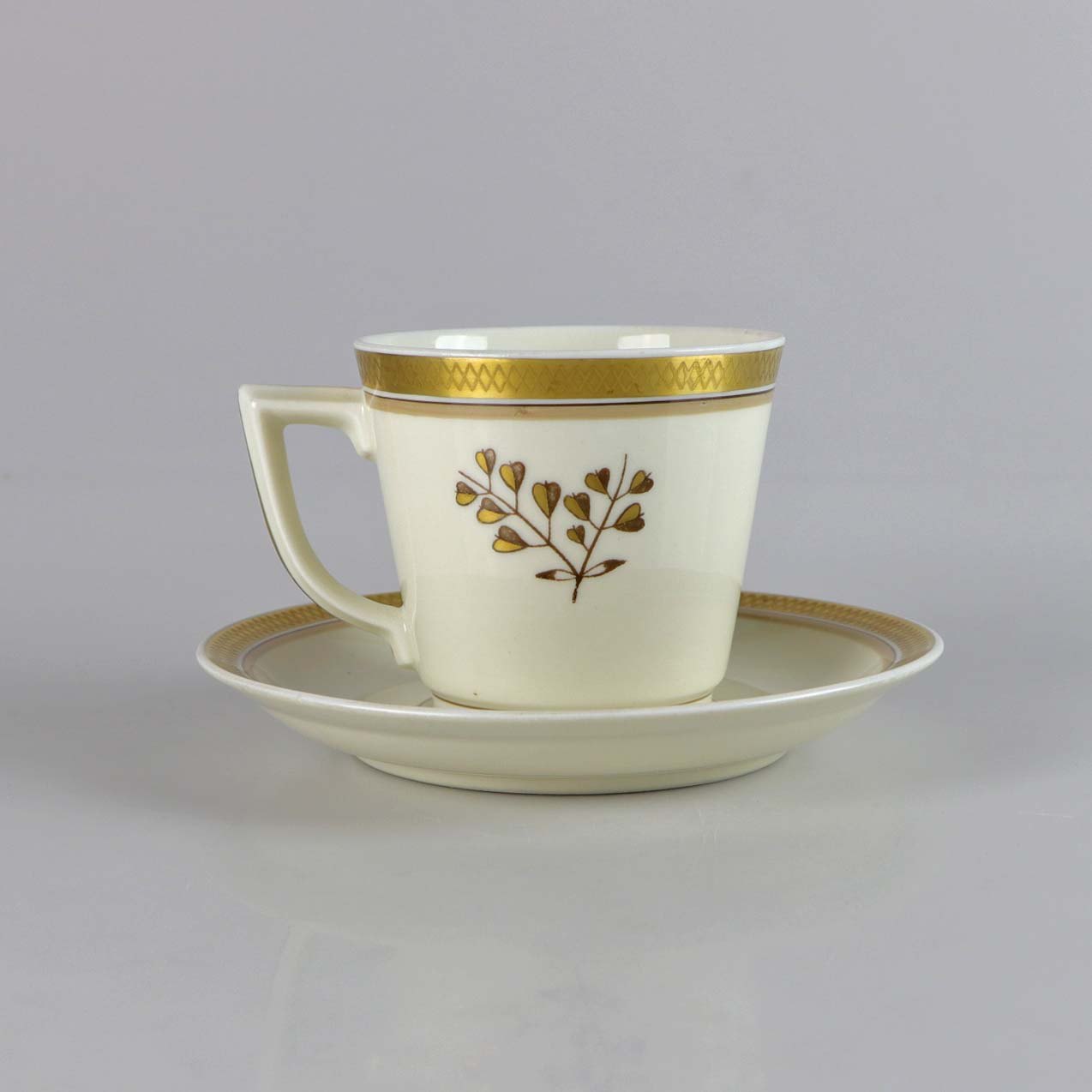 Cremefarvet porcelæn med motiv af gylden kløverblomst og bred graveret guldkantkant.