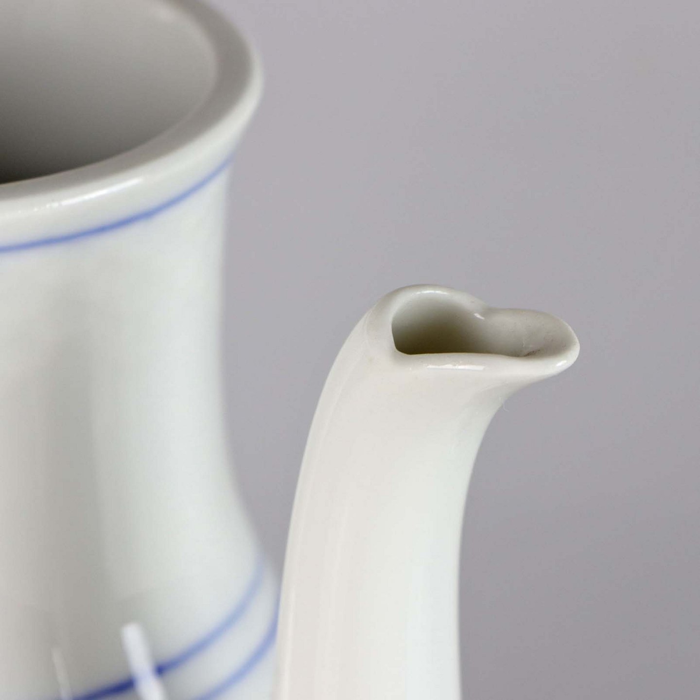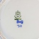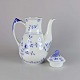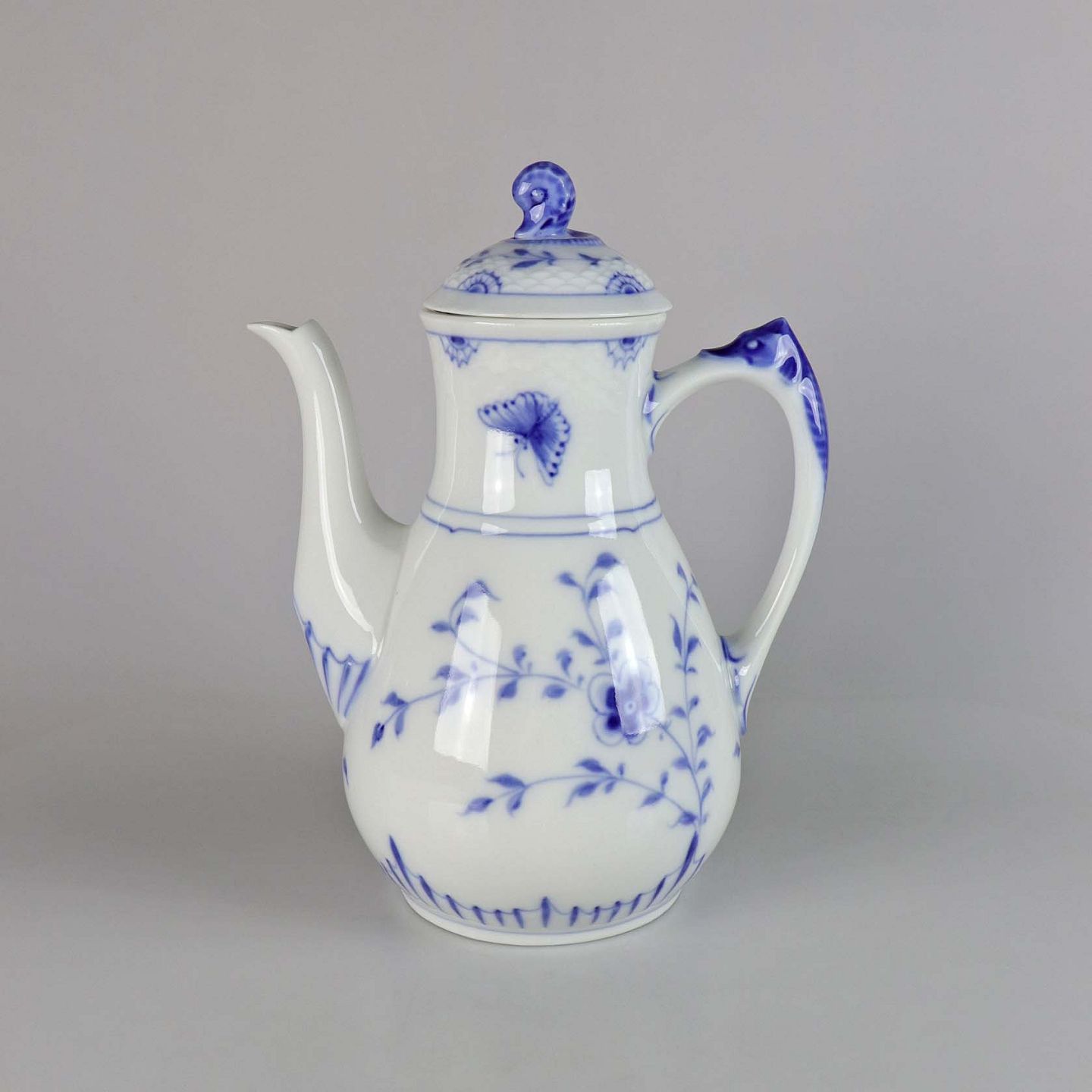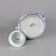 Kande i hvidt skælformet porcelæn med blå motiver af blomster og sommerfugle.