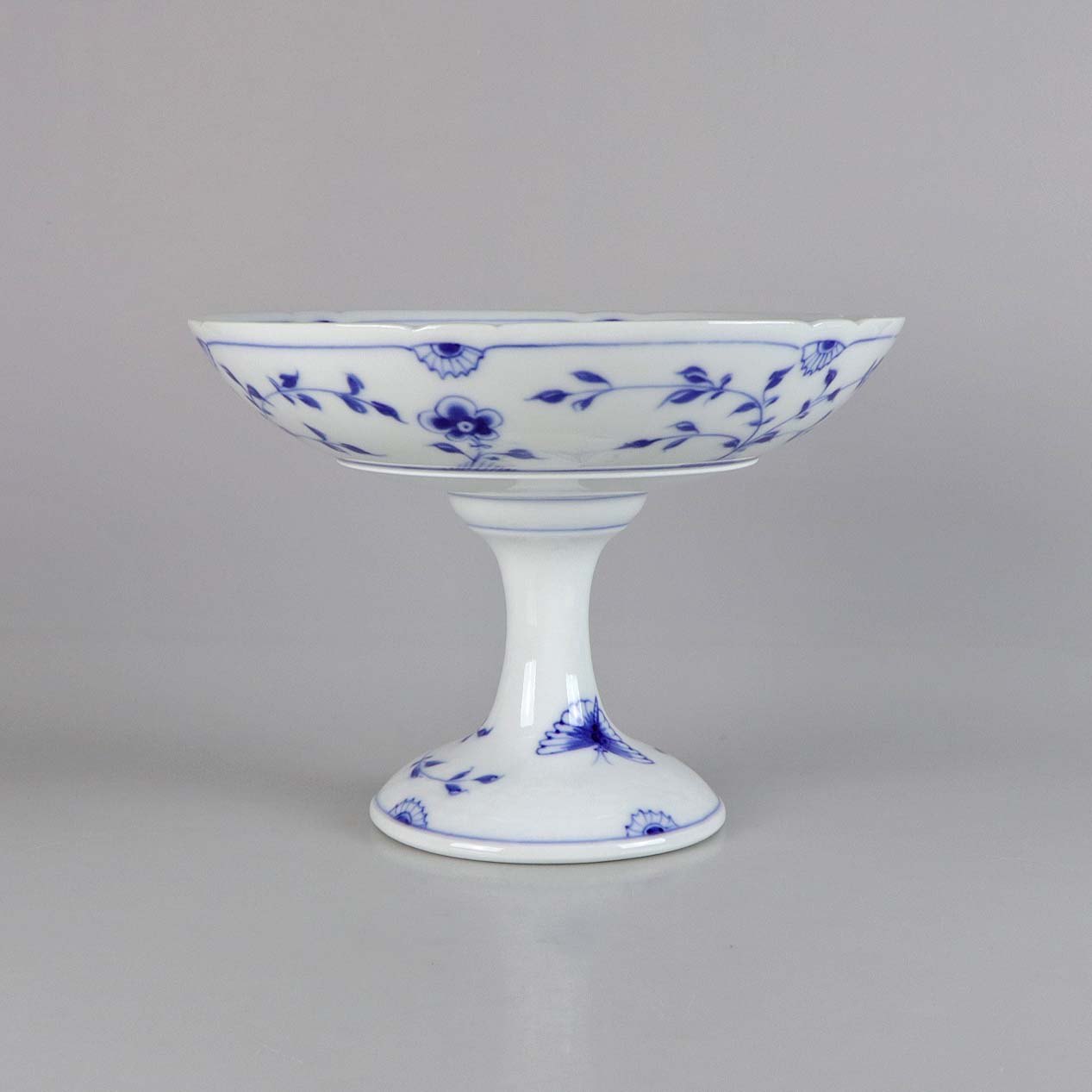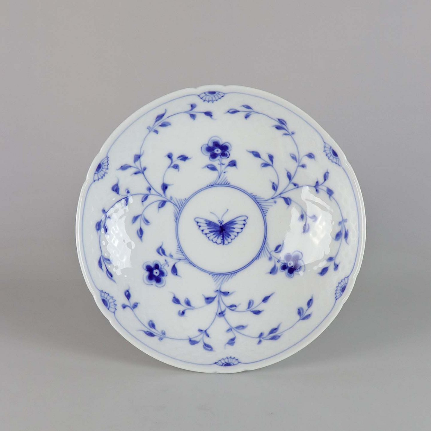 Fad i hvidt skælformet porcelæn med blå motiver af blomster og sommerfugle.