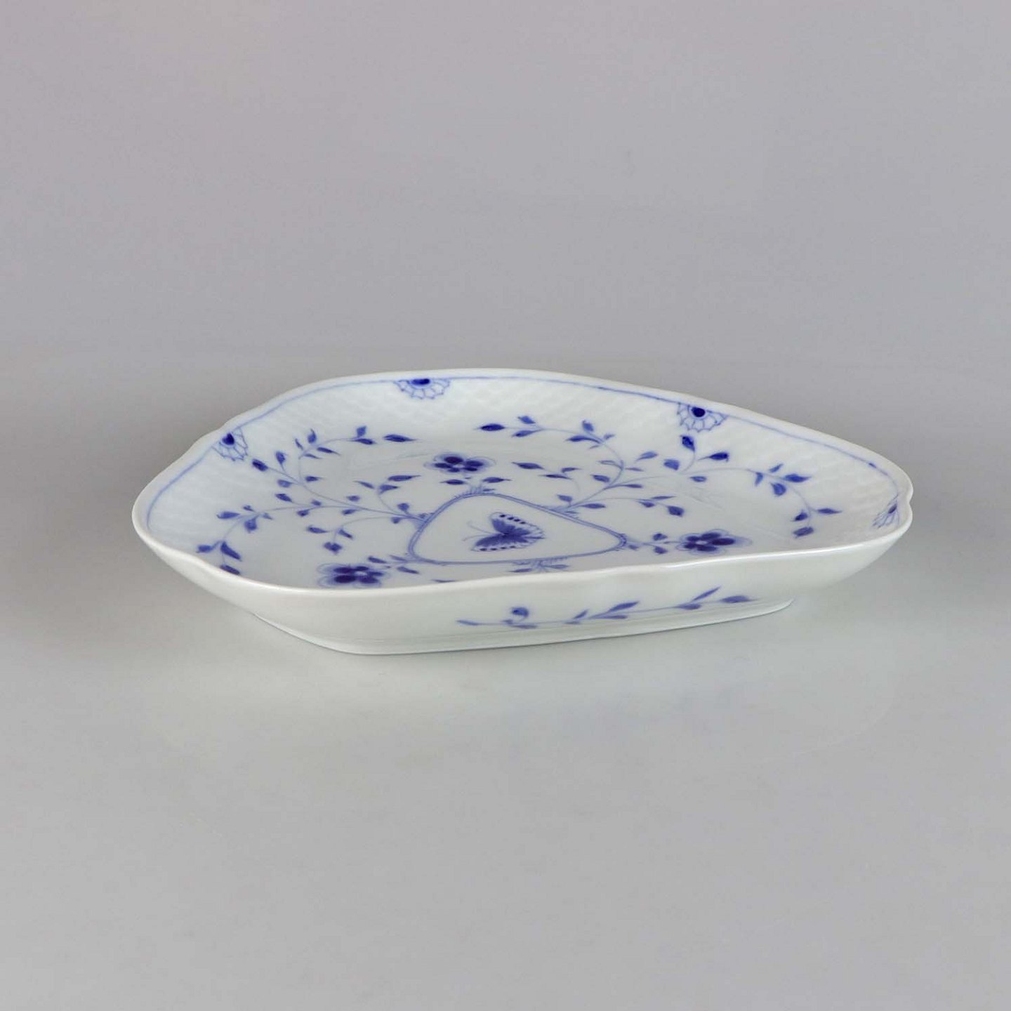 Fad i hvidt skælformet porcelæn med blå motiver af blomster og sommerfugle.