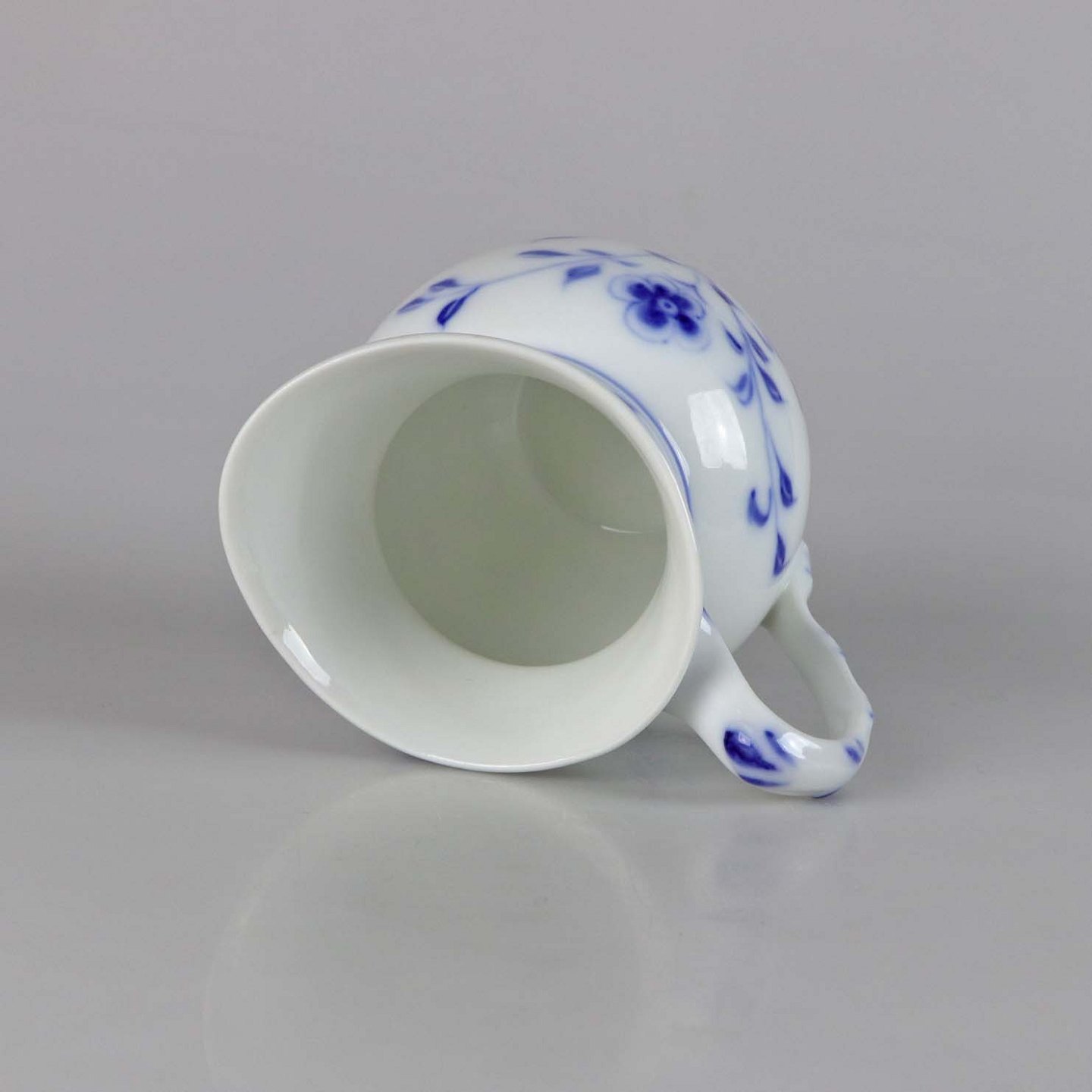 Mælkekande i hvidt skælformet porcelæn med blå motiver af blomster og sommerfugle.
