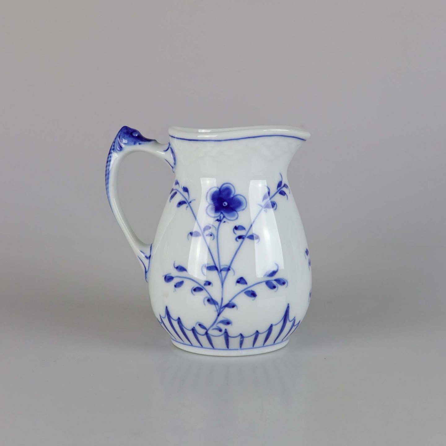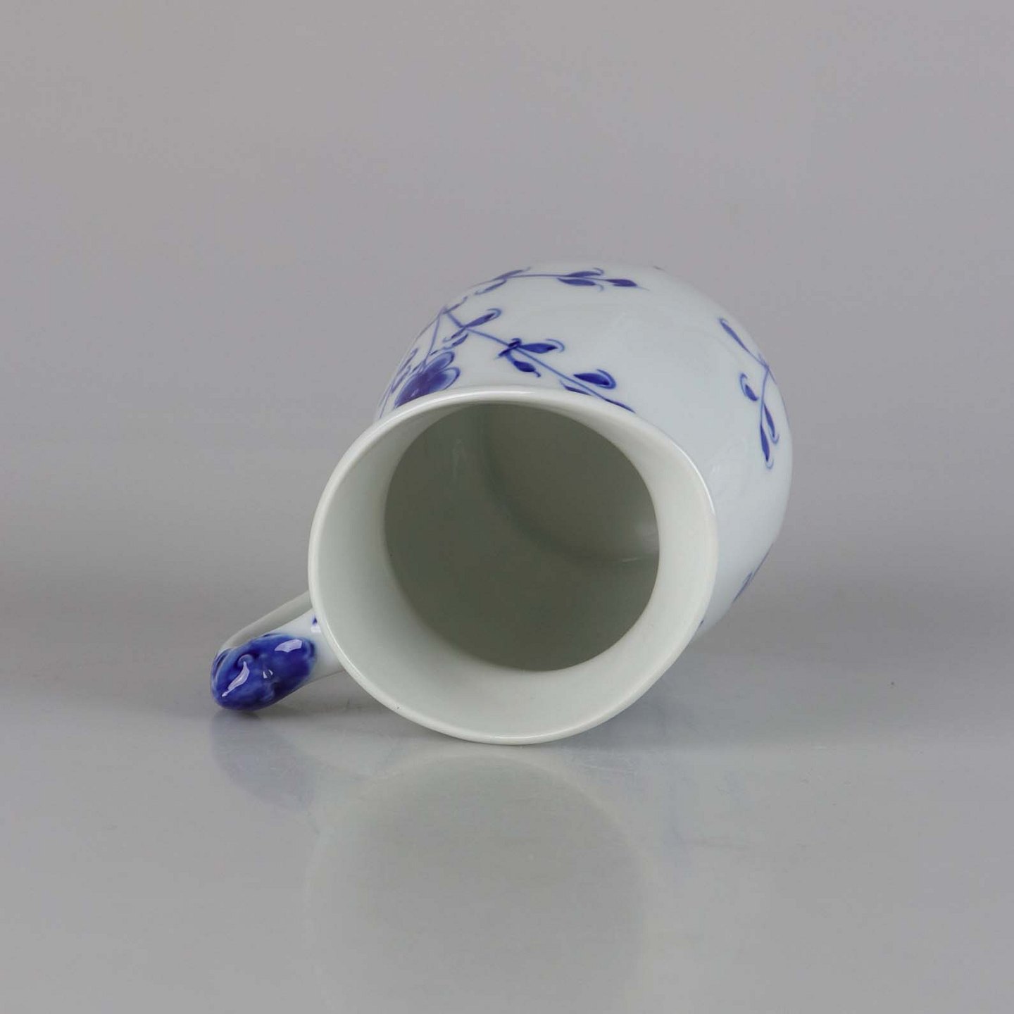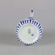 Kande i hvidt skælformet porcelæn med blå motiver af blomster og sommerfugle.