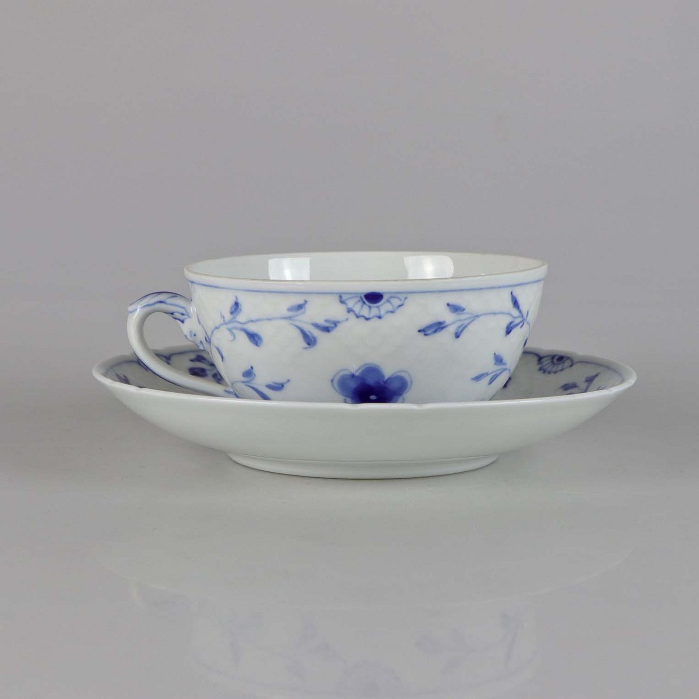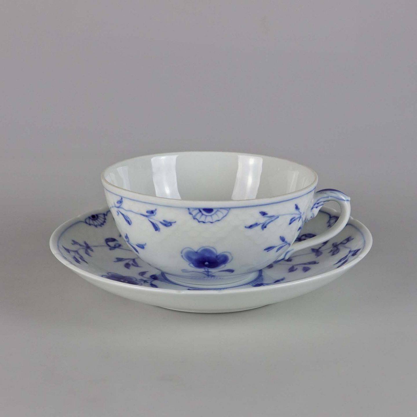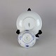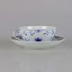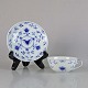 Kop i hvidt skælformet porcelæn med blå motiver af blomster og sommerfugle.