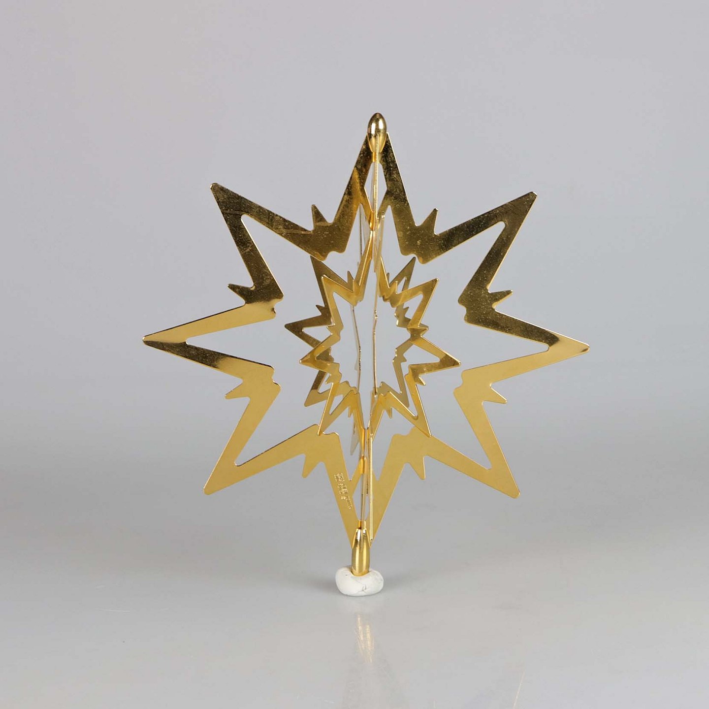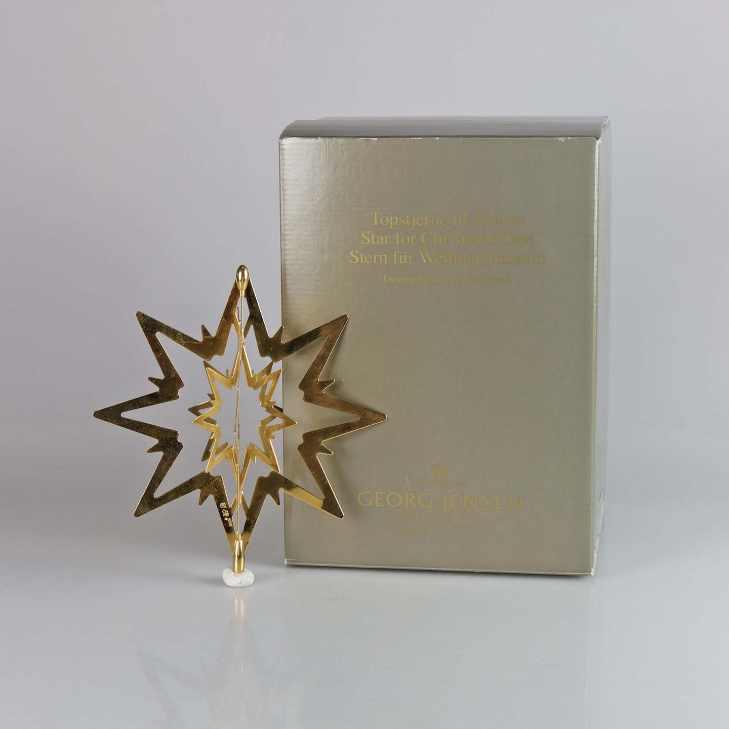 Topstjerne til juletræ i forgyldt messing med original boks. Størrelse Lille. Mærket Georg Jensen Denmark Gold Plated