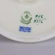 Stel i glat råhvidt porcelæn dekoreret med lysegrøn stribe og guldkant samt motiv af hjertegræs.