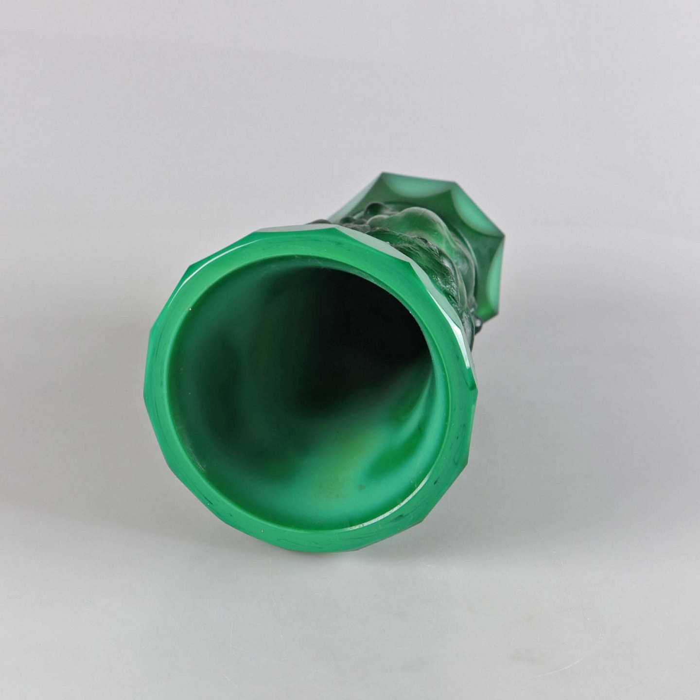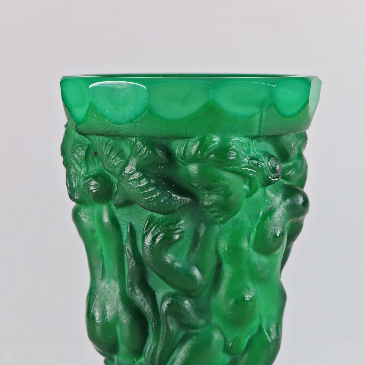 Bohemisk tjekkisk Art Deco vase 'Ingrid' af malakit, støbt med relief i form af nøgne kvindefigurer, fugle og blomster.