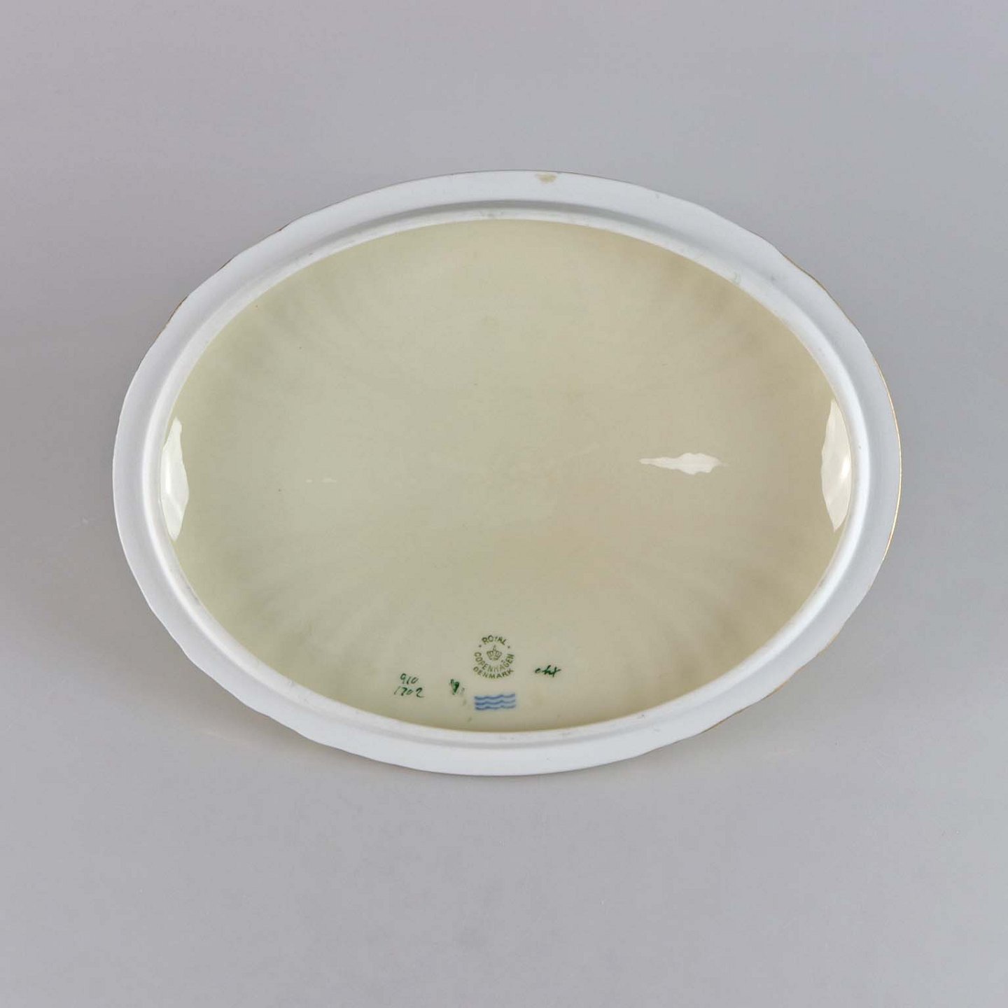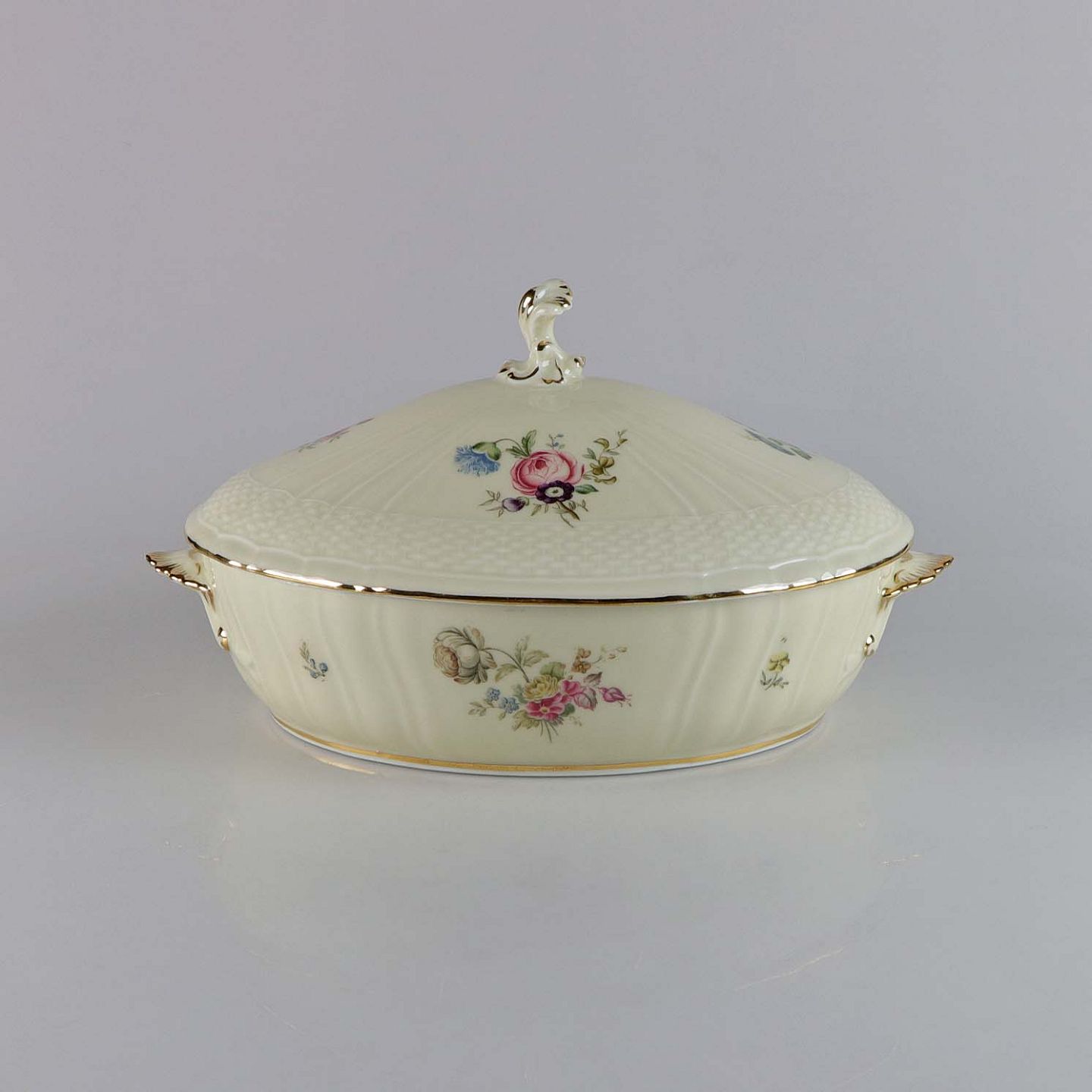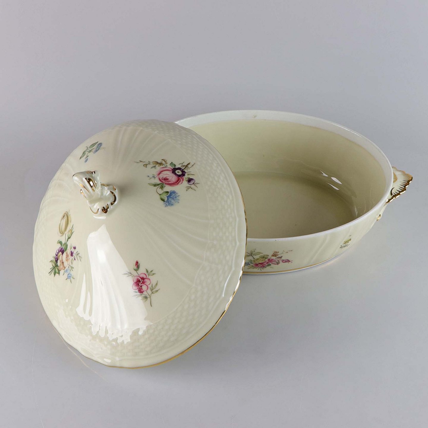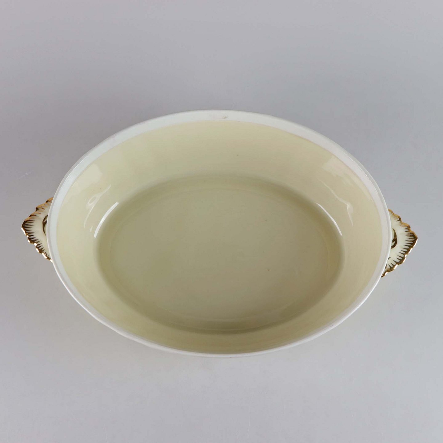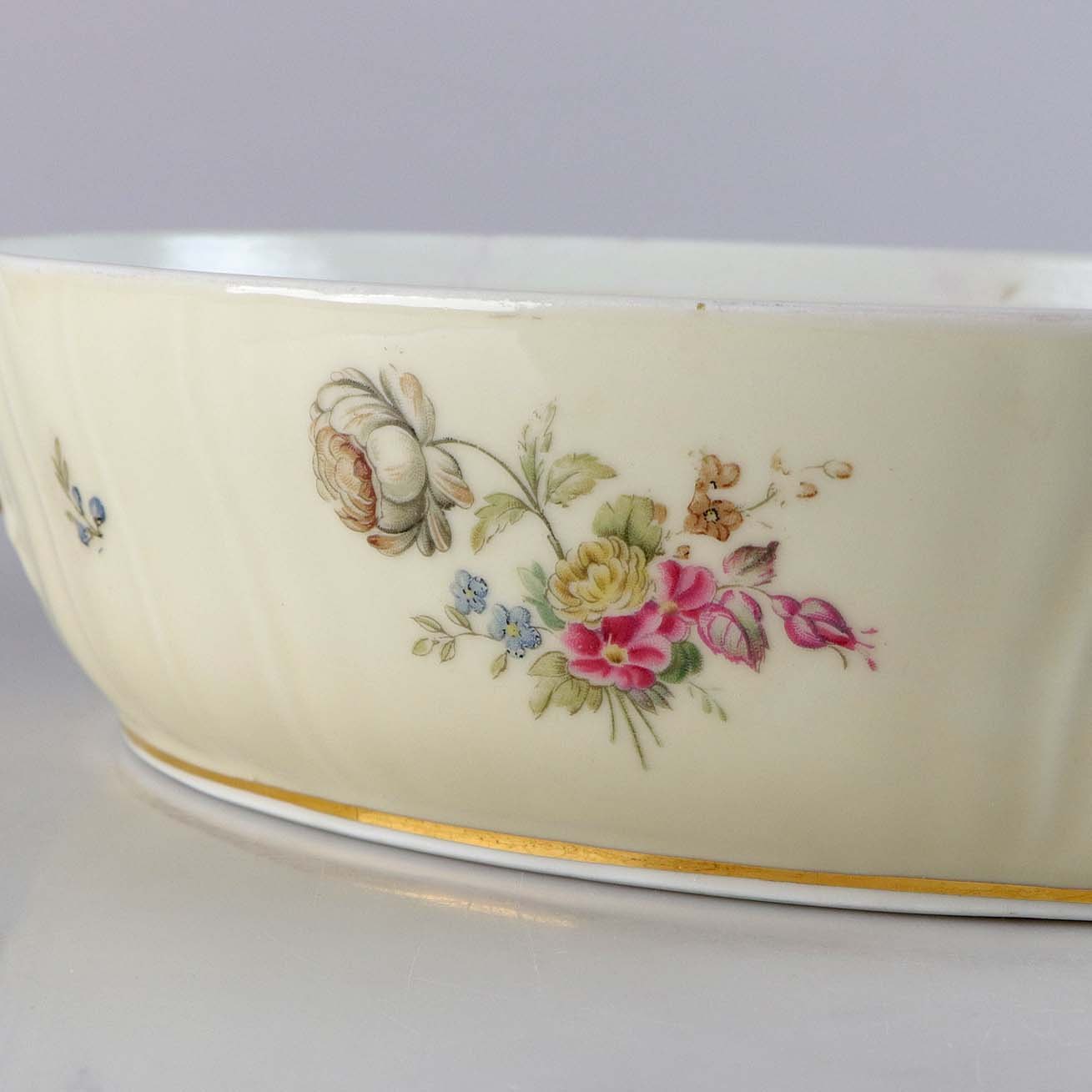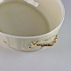 Lågfad i cremefarvet porcelæn med flettet og forgyldt kant samt overførte blomstermotiver.
