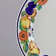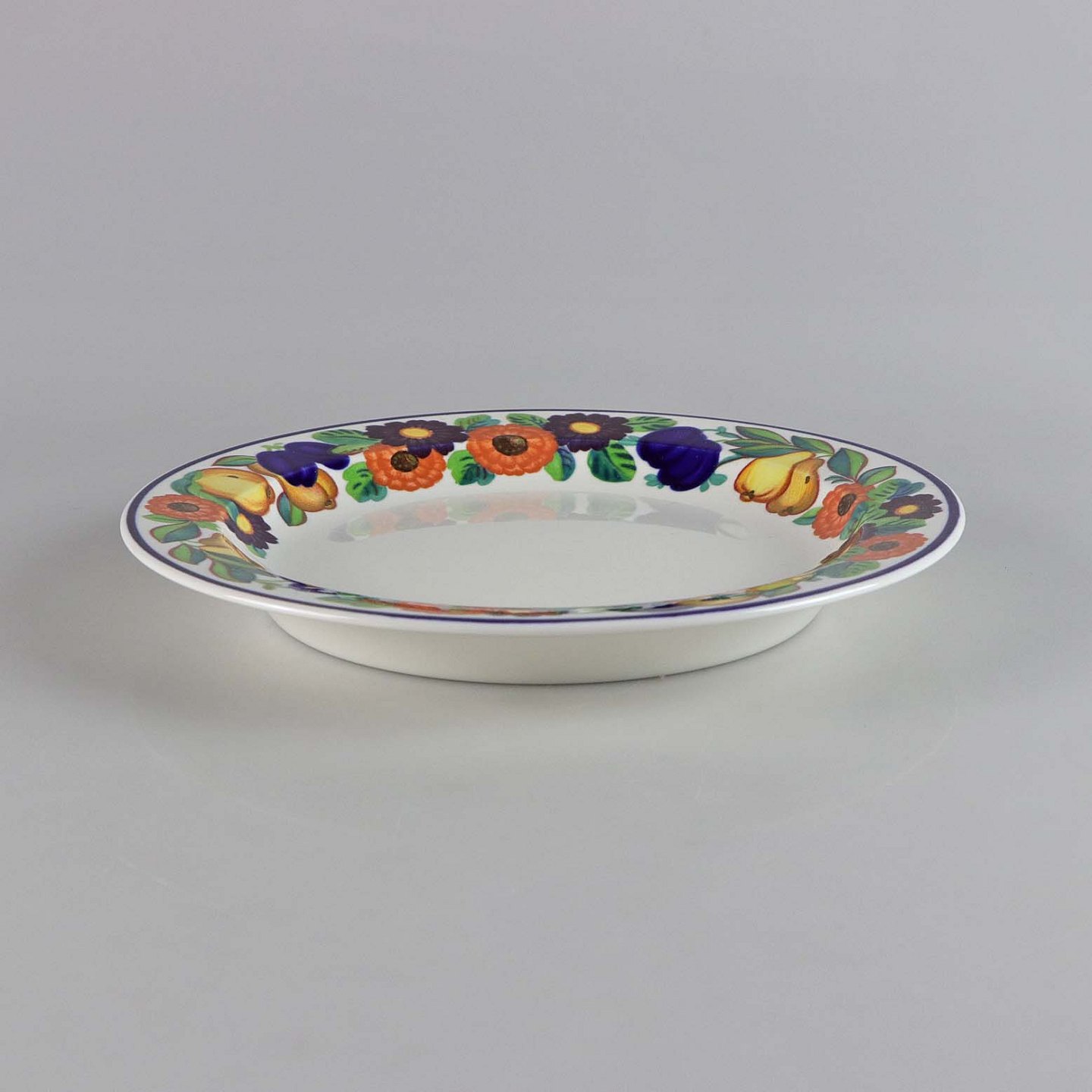 Tallerken i glat hvidt porcelæn med blå kant og dekoreret med sommerblomster og frugter.