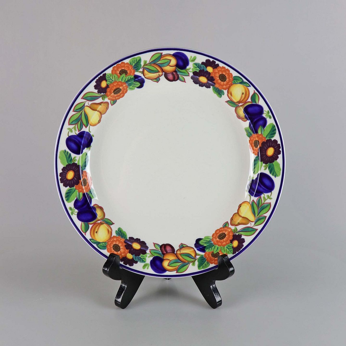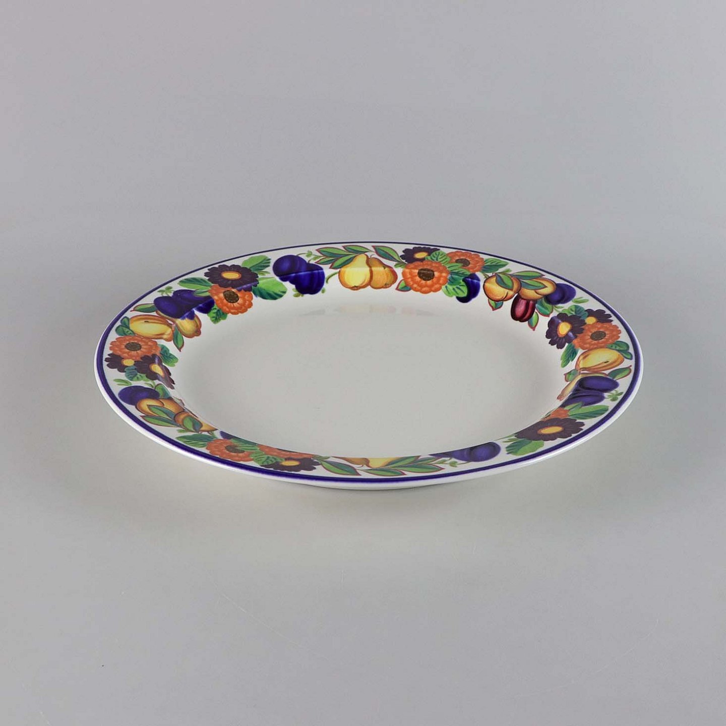 Tallerken i glat hvidt porcelæn med blå kant og dekoreret med sommerblomster og frugter.