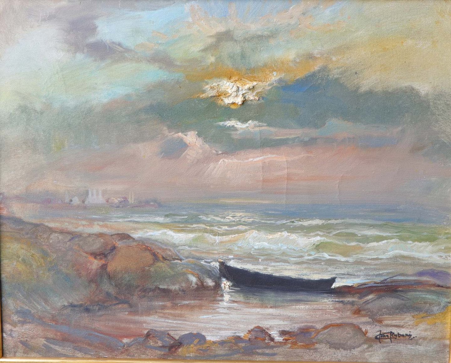 Maleri med landskabsmotiv af kyststrækning med robåd