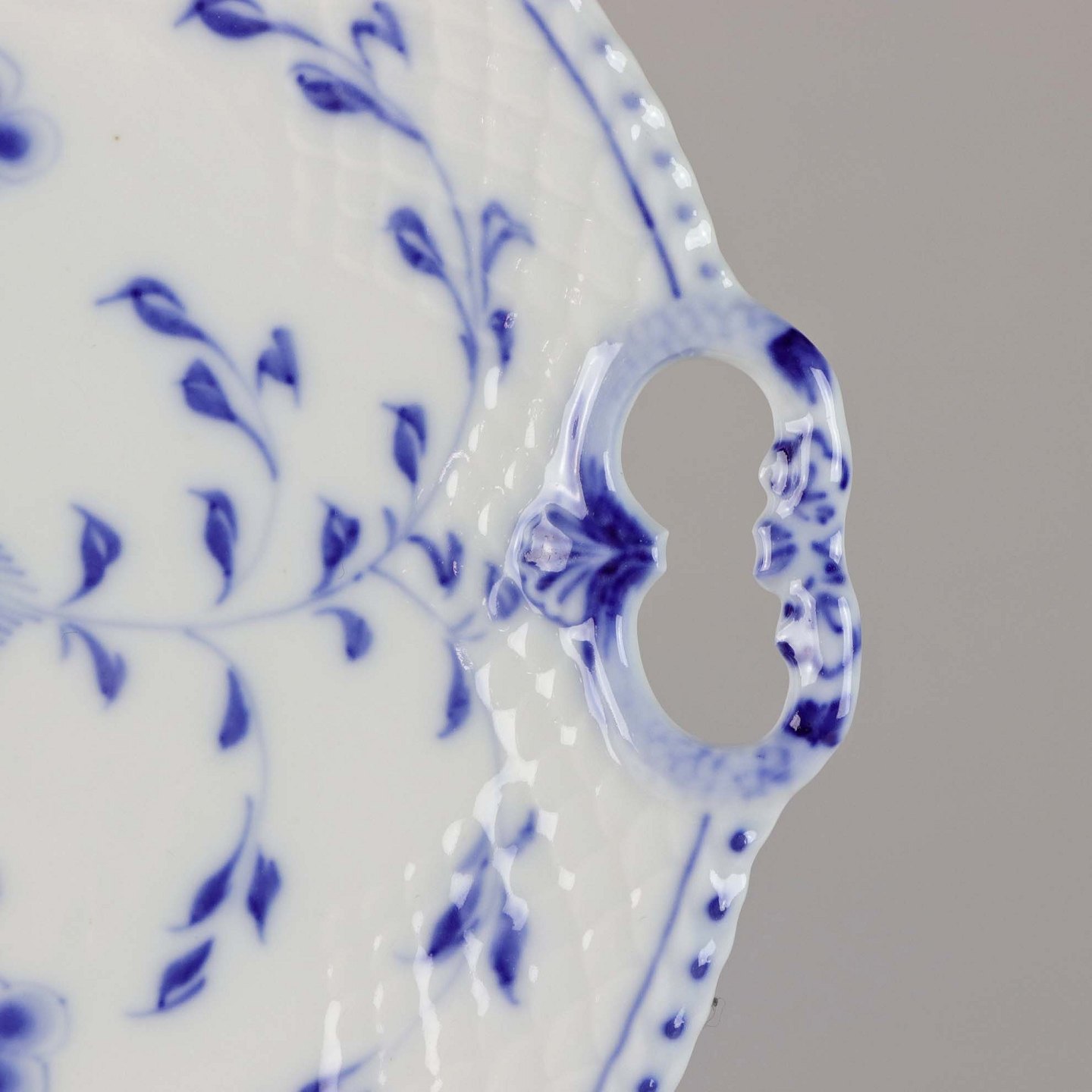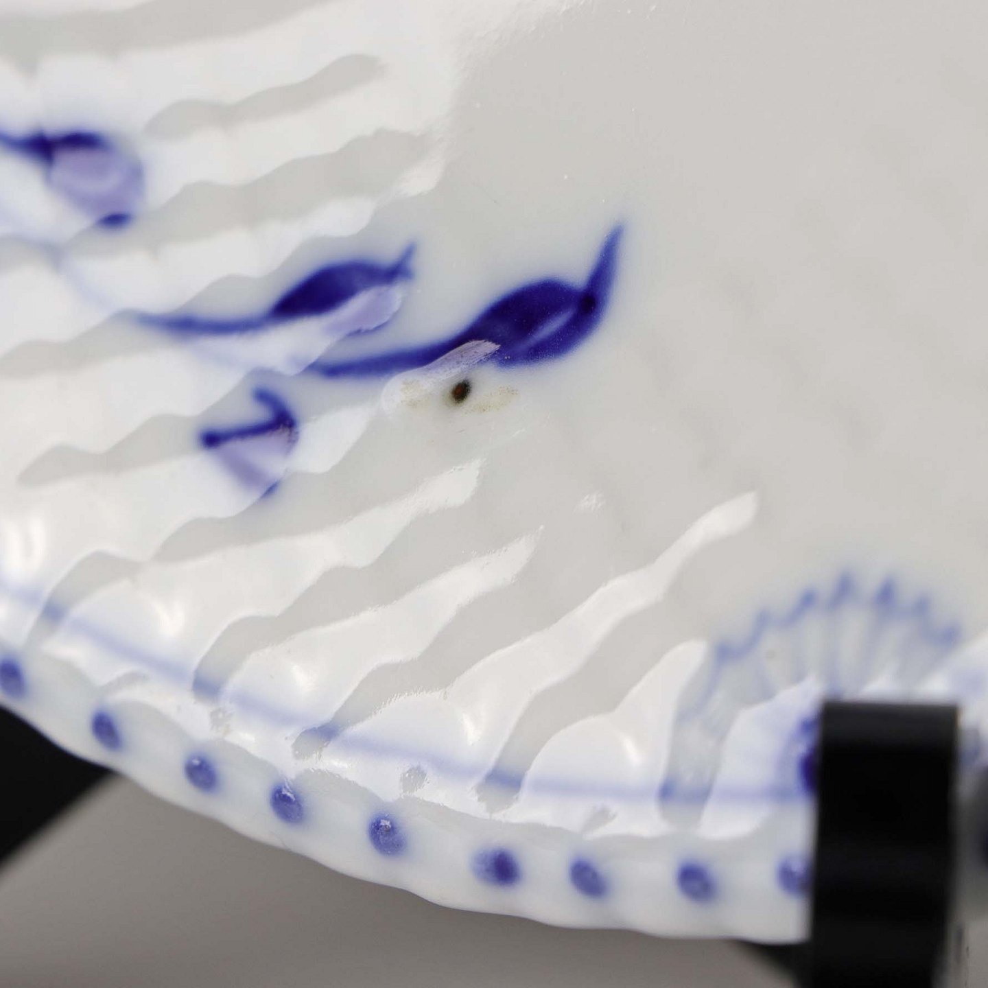 Skål i hvidt skælformet porcelæn med blå motiver af blomster og sommerfugle.