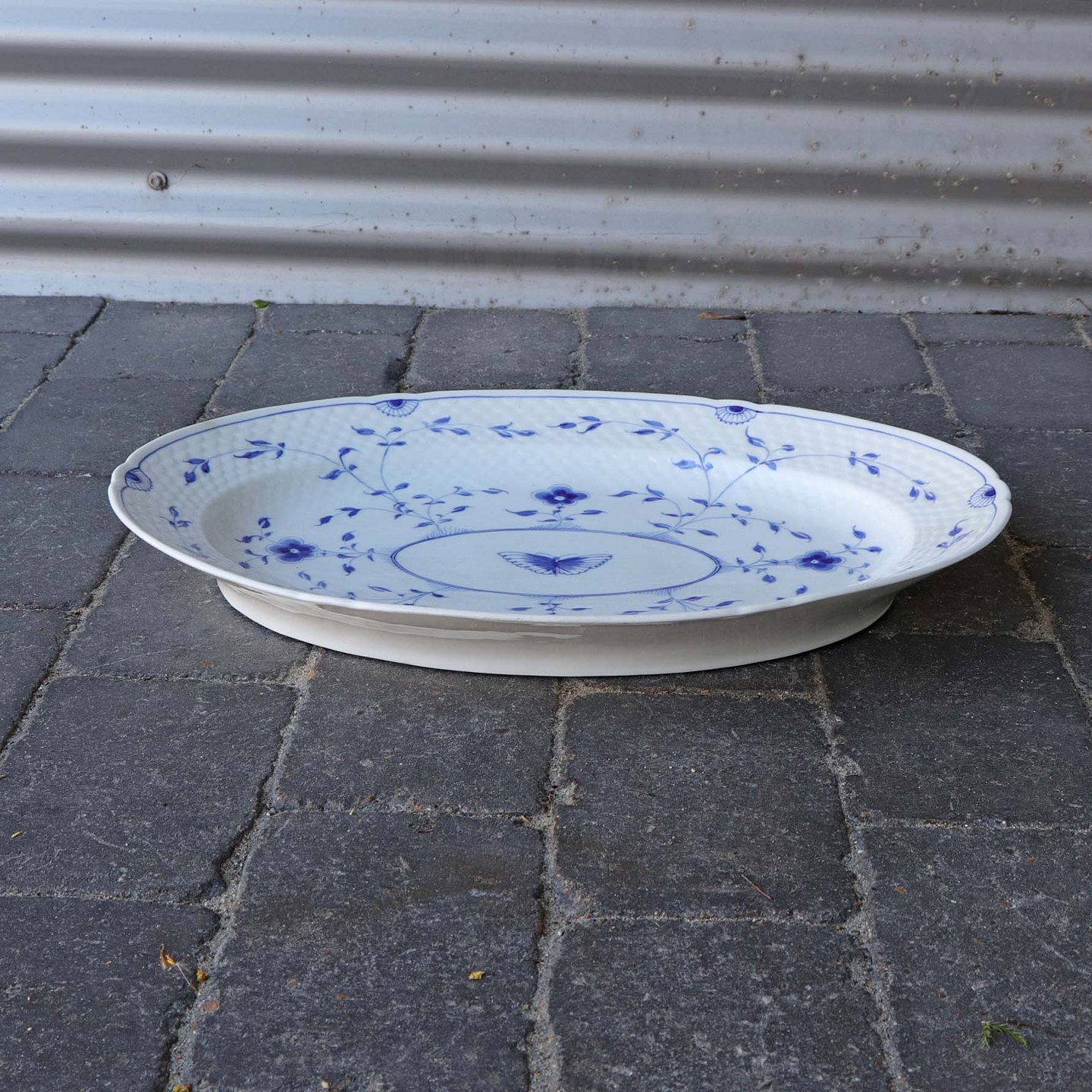 Service i hvidt skælformet porcelæn med blå motiver af blomster og sommerfugle.