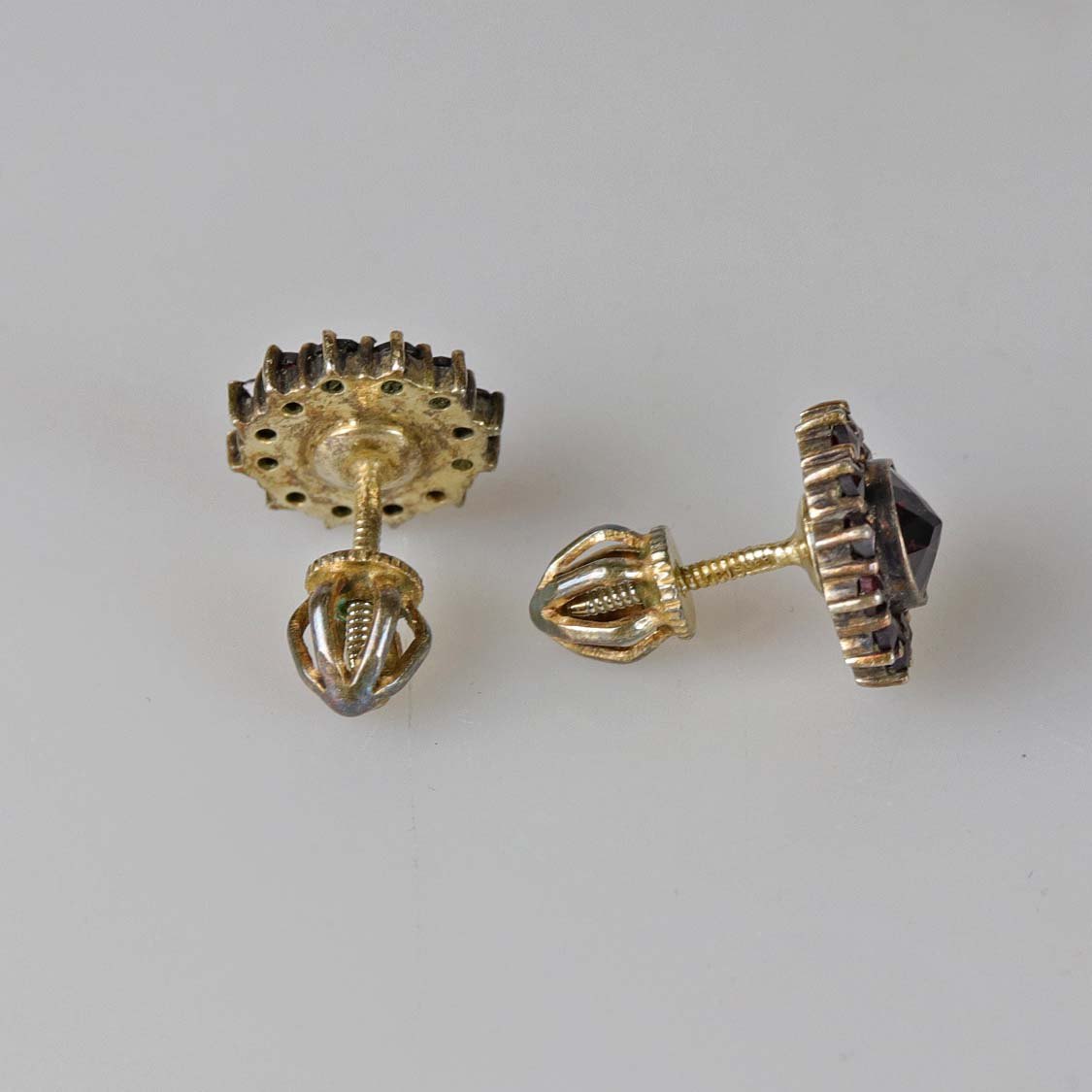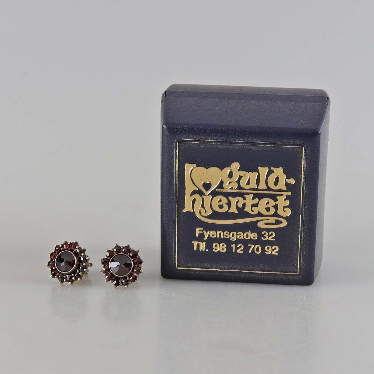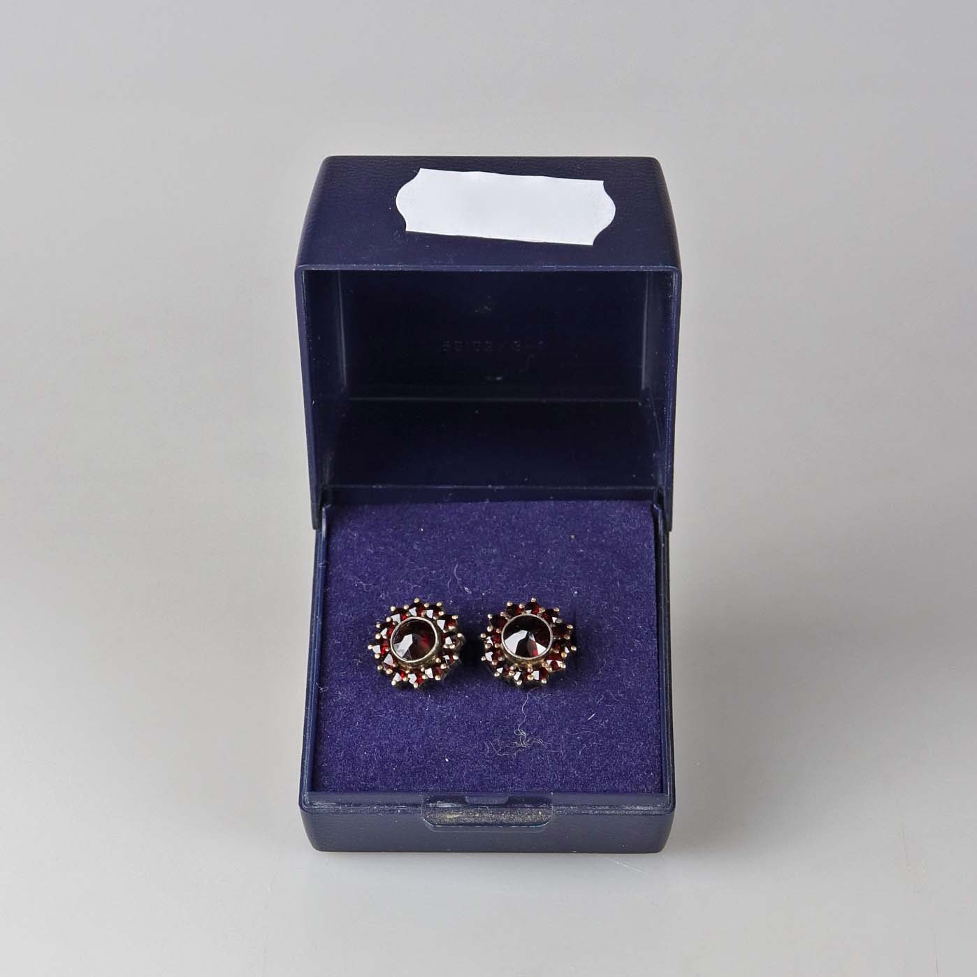 Ørestikker i guld double med granater. Der er gevind på ørestikken så låsen skrues på.