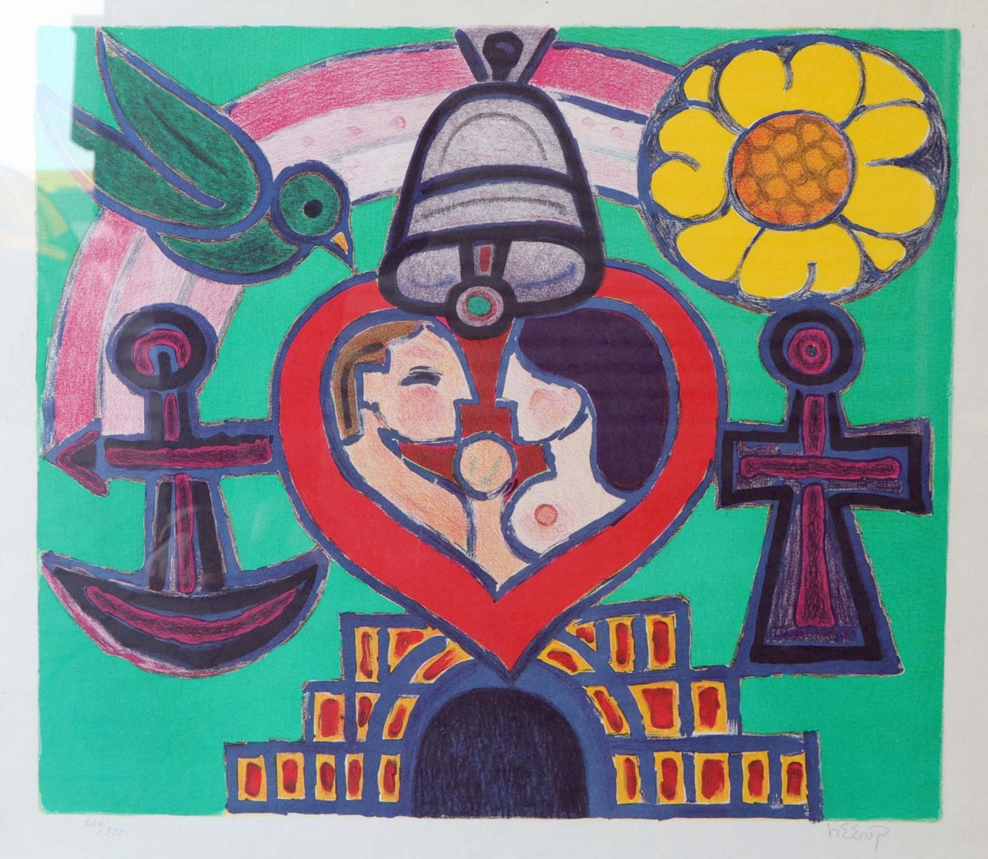 Indrammet litografi med titlen Tro, håb og kærlighed no 364/375