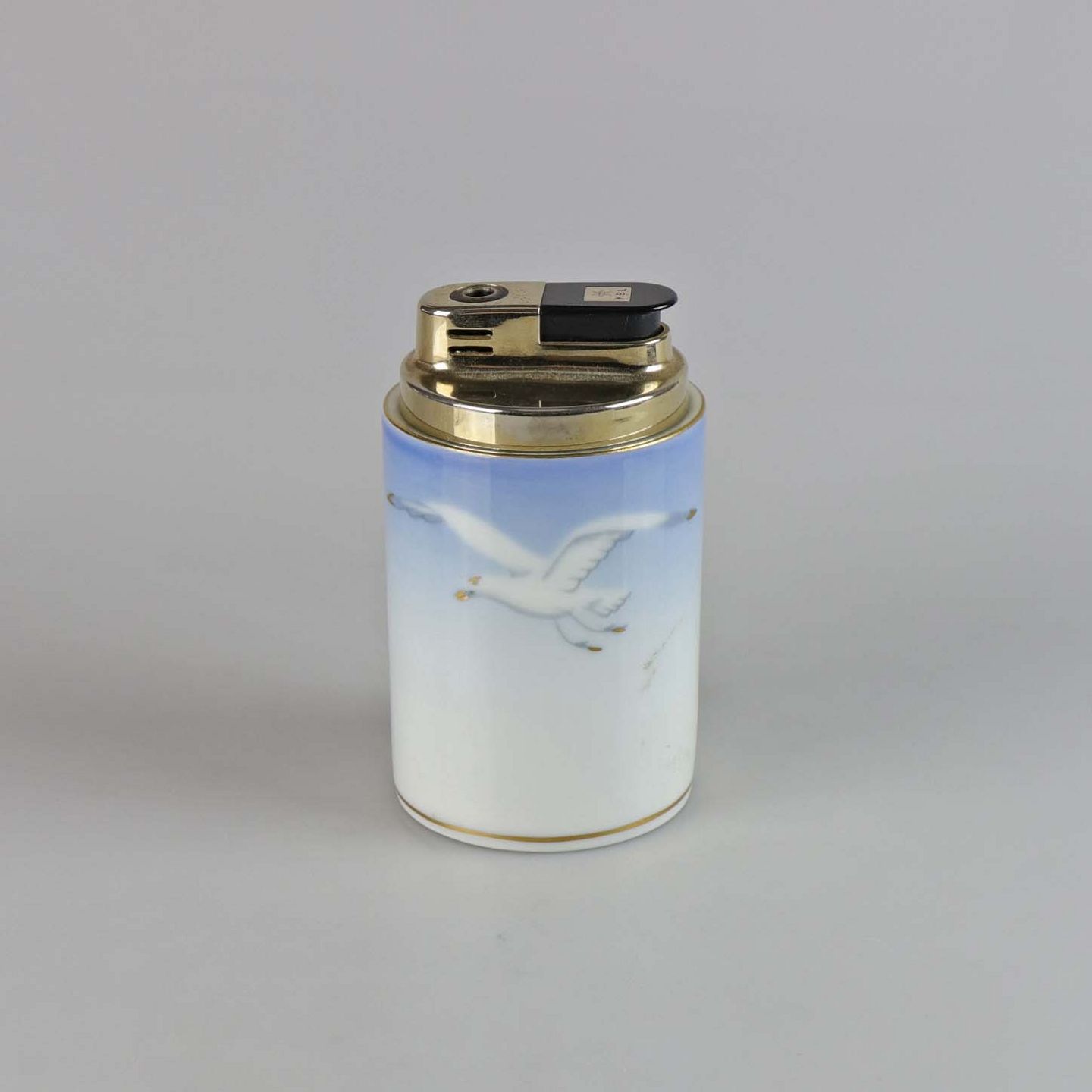 Lighter med porcelæn i blålige farver dekoreret med måger og guldkant