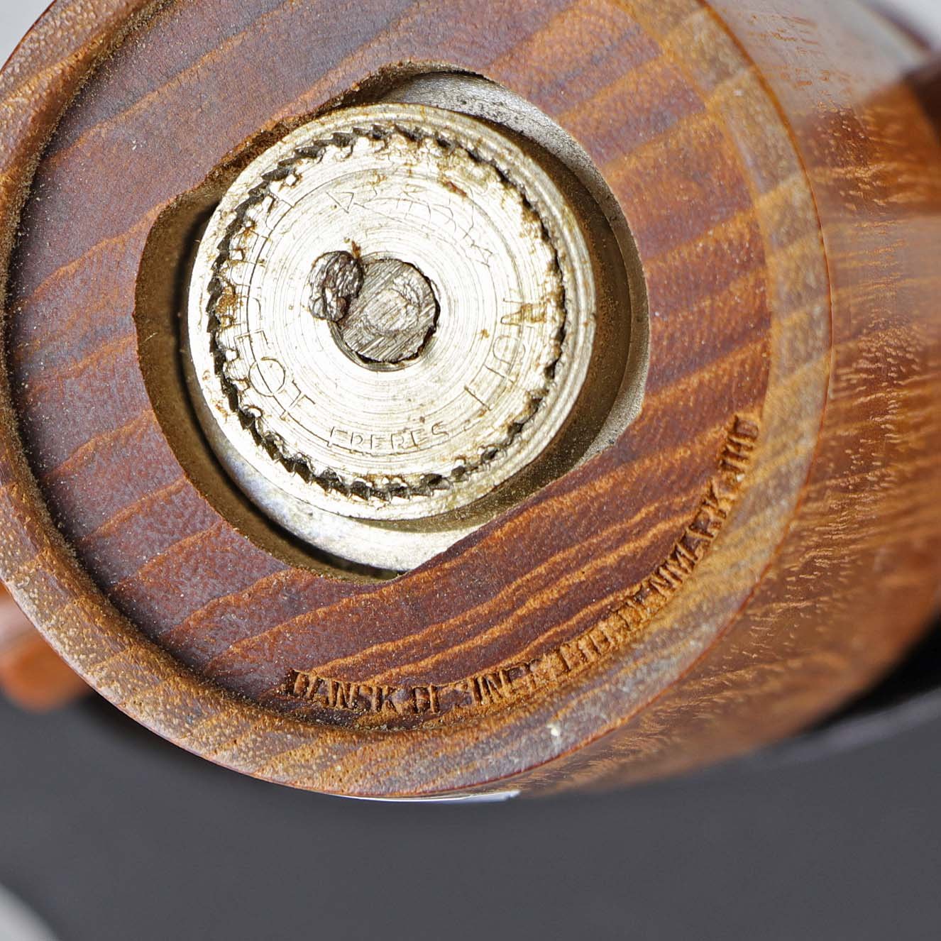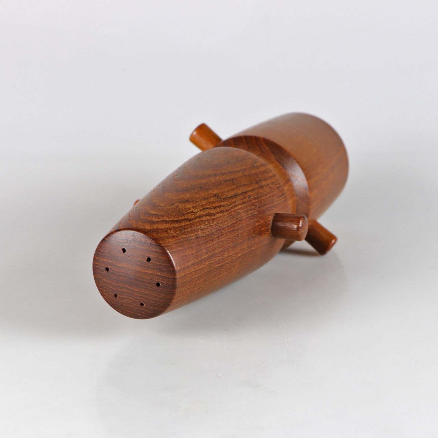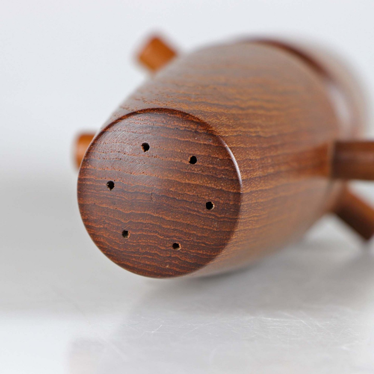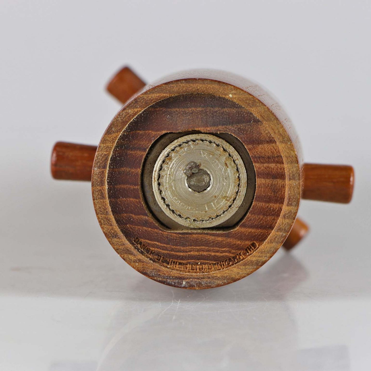 Saltkværn i den ene ende og peberkværn i den anden ende. Kværnen er af teak