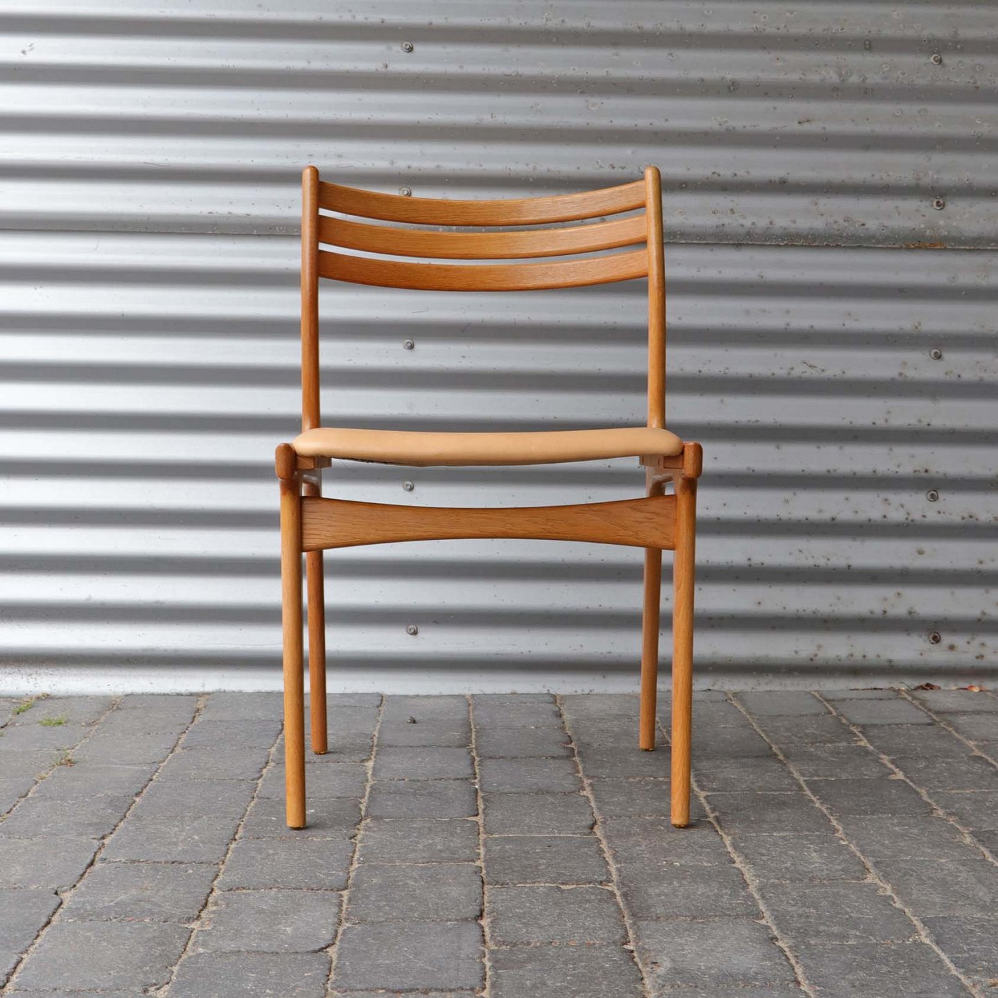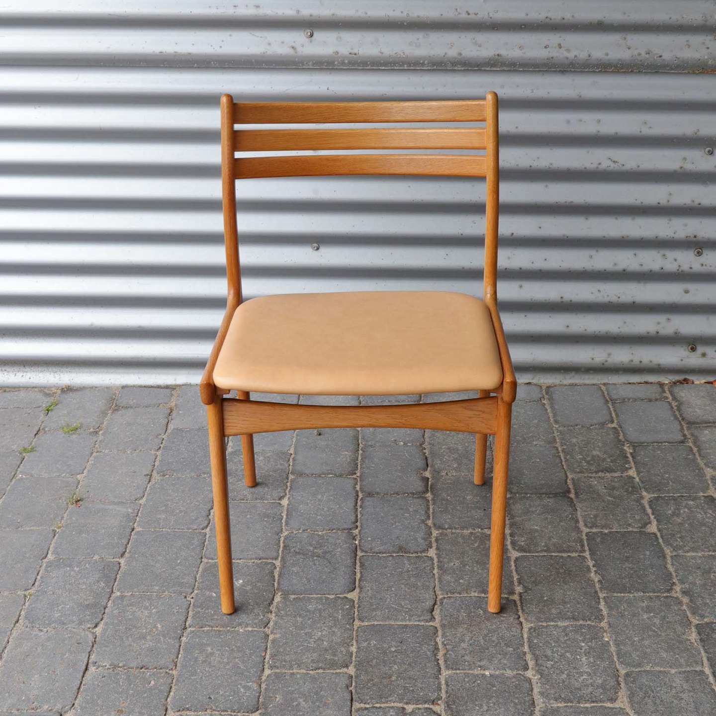 Sæt med 8 spisebordsstole i lakeret egetræ og sæder med beigefarvet læder