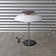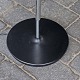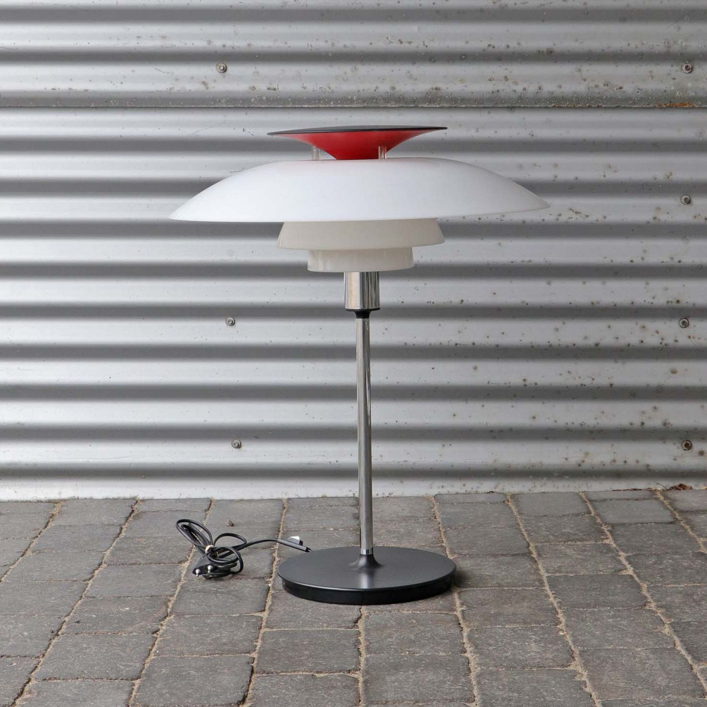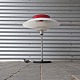 Lampe med fod i blankpoleret stål. Skærm af plast i hvid og rød
