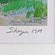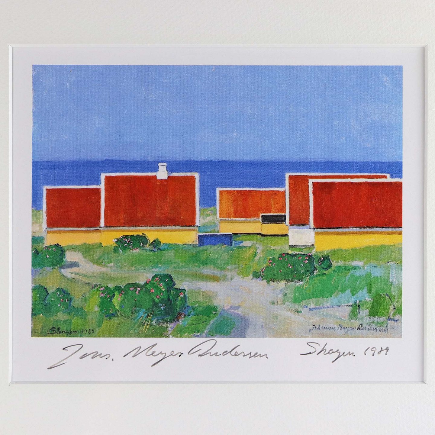 Tryk med teksten Skagen 1989 med motiv af røde hustage ved kystlinje