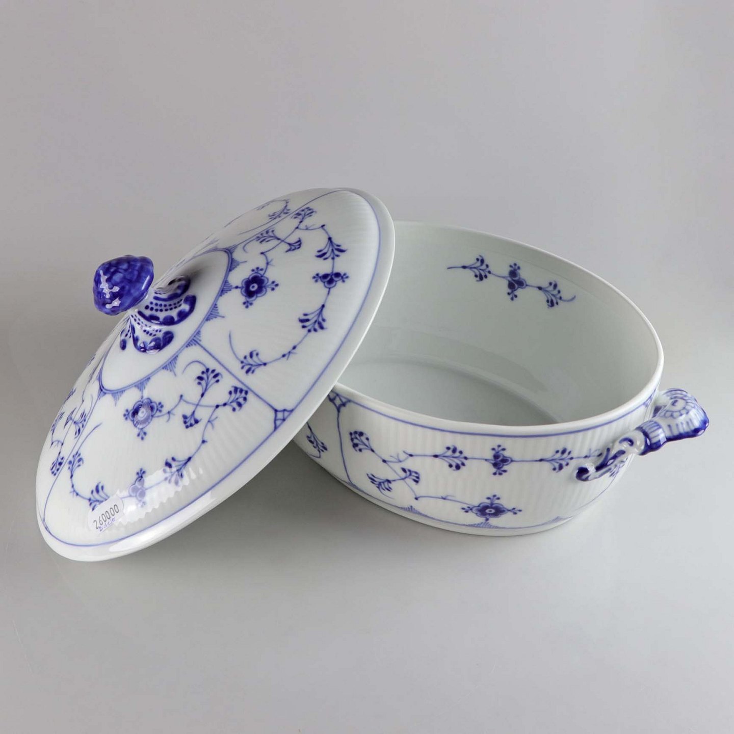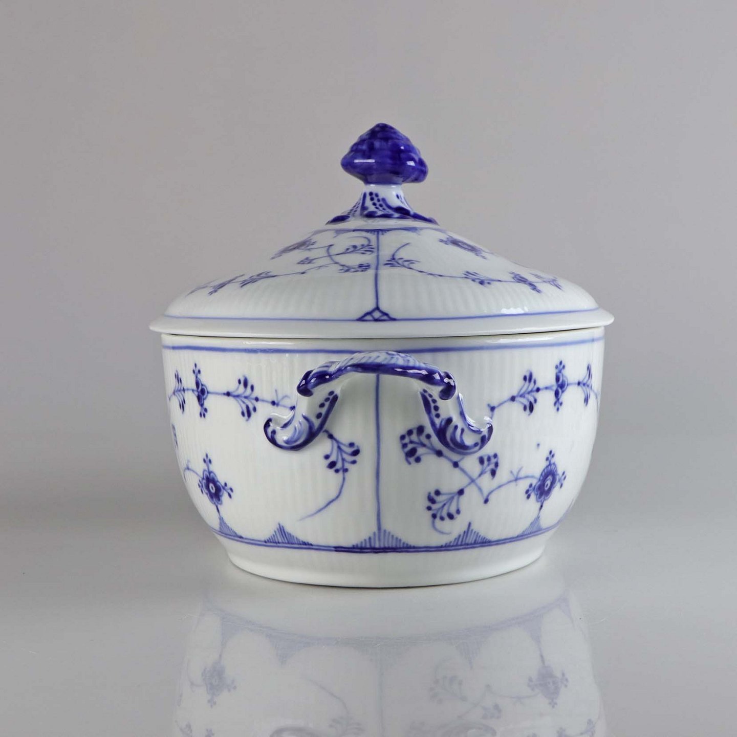 Suppeterrin i riflet hvidt porcelæn med dekoration af blå ranker