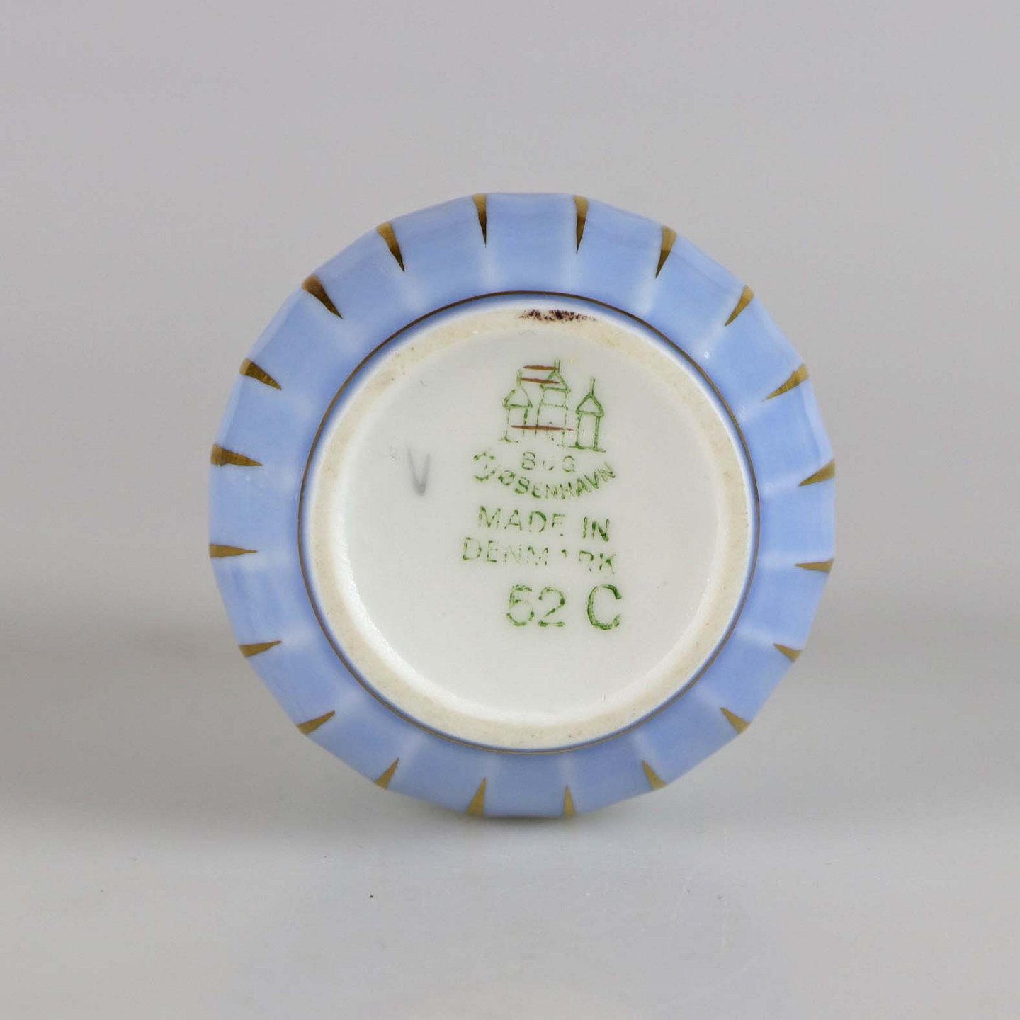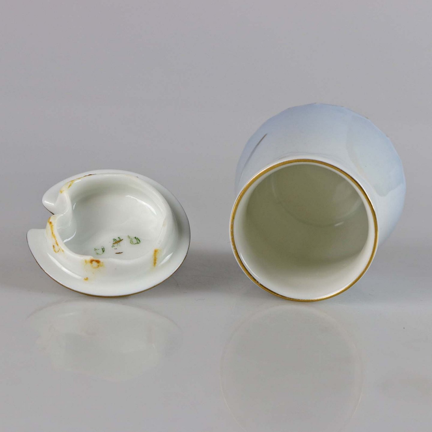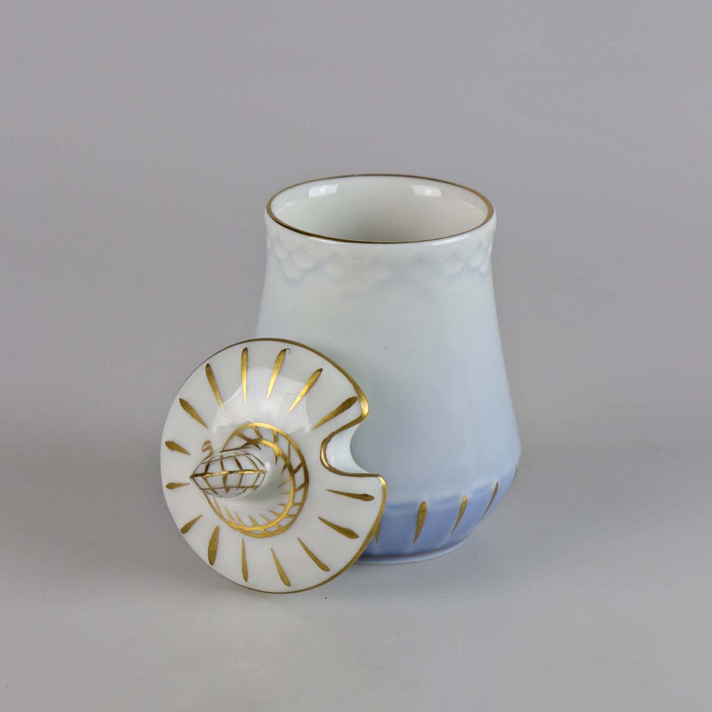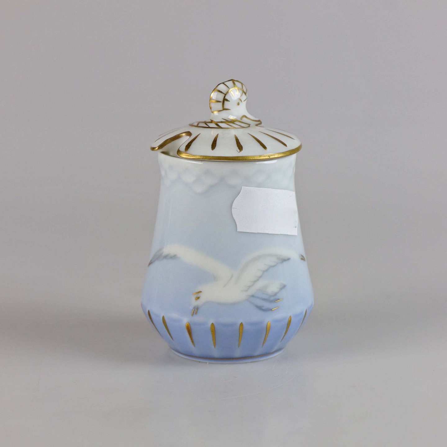 Krukke af porcelæn i blålige farver med motiv af måger og guldkant
