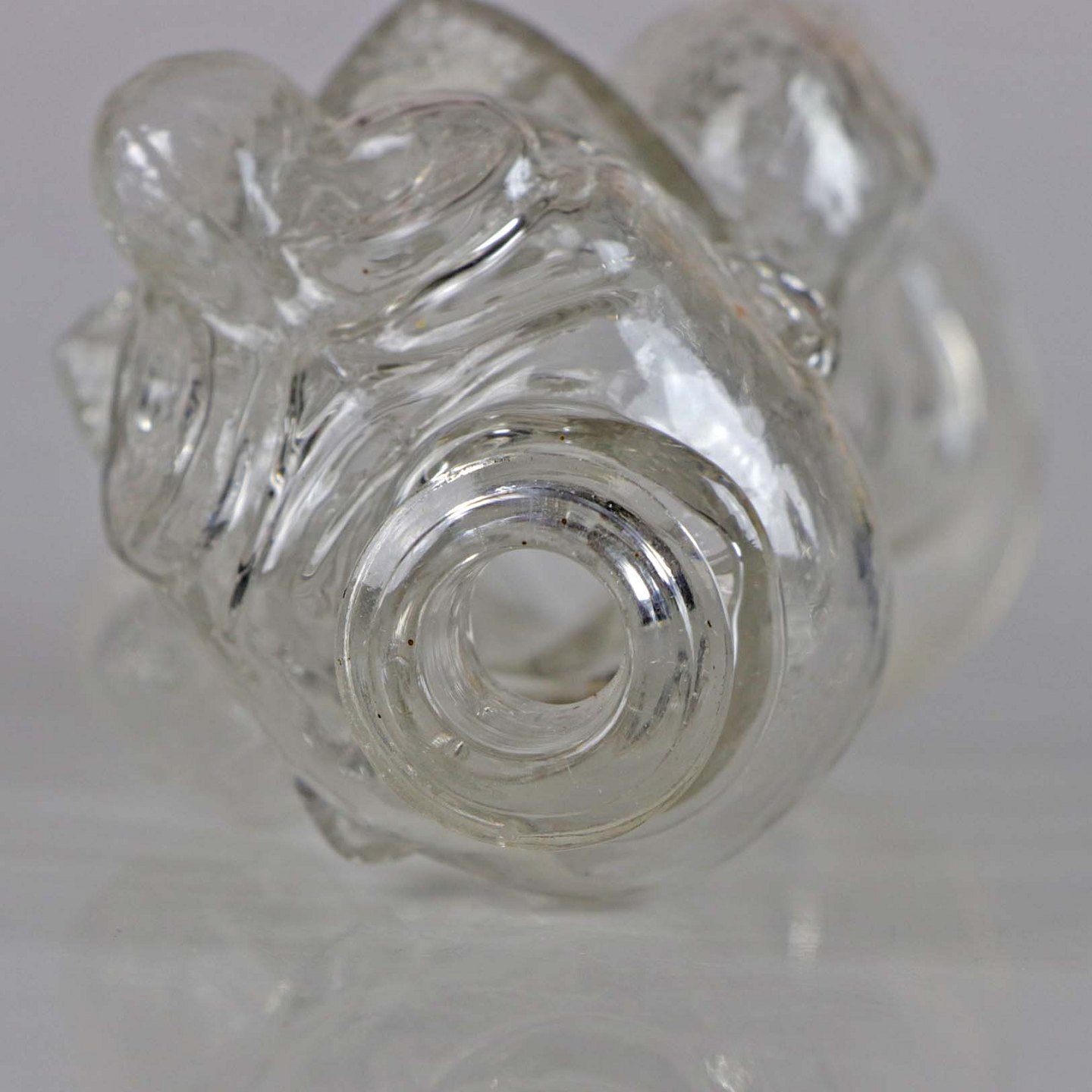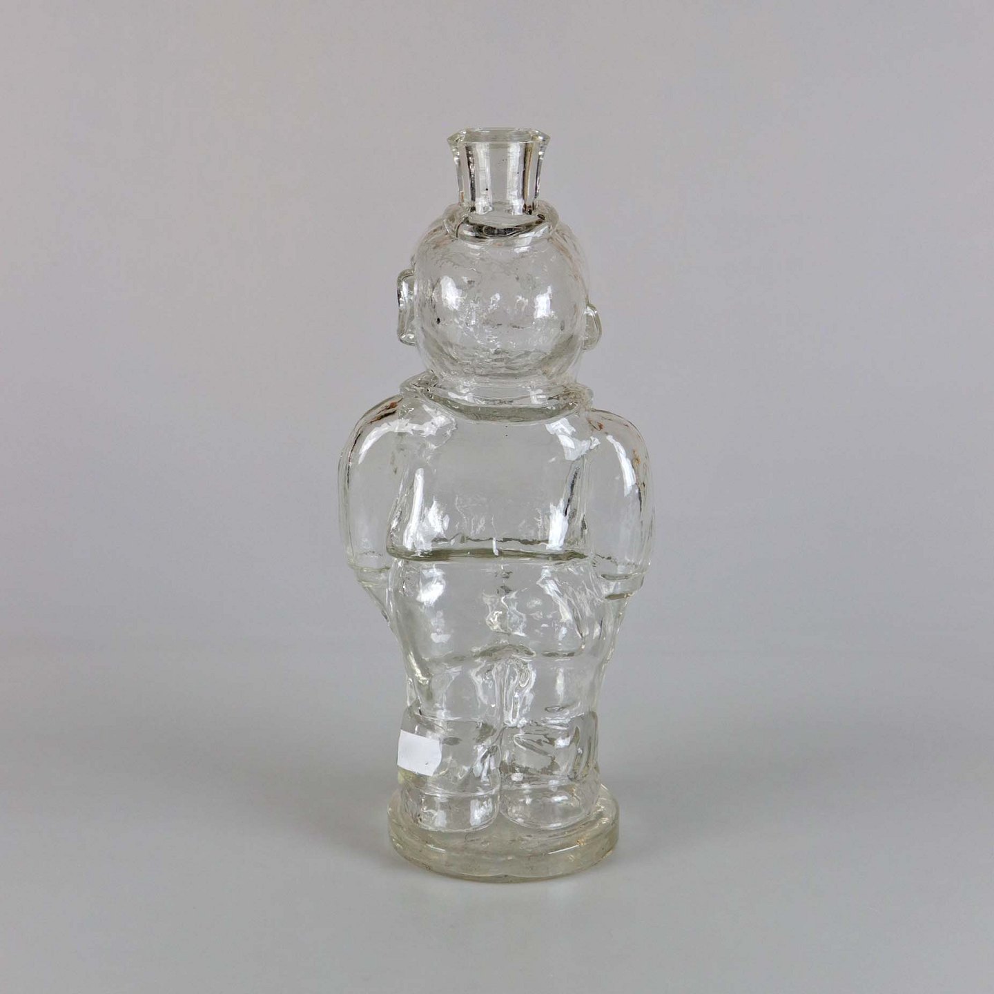 Meget sjælden mundblæst figurflaske af glas, formet som Storm Petersen figuren "Peter" med lille hals og munding til korkprop.
