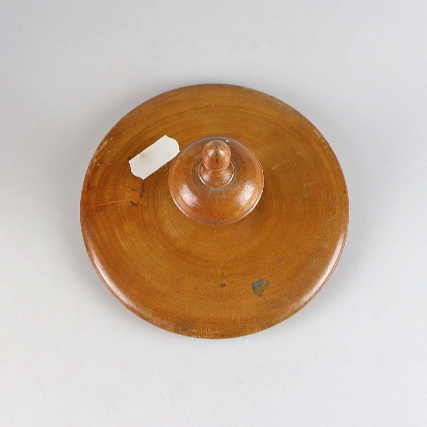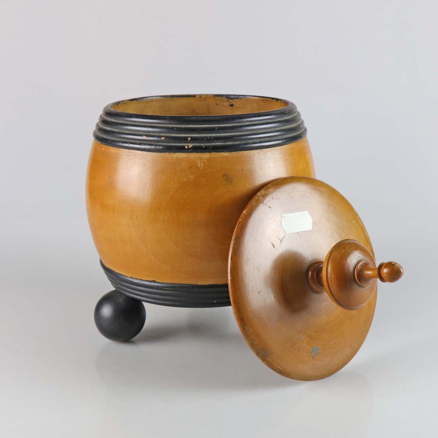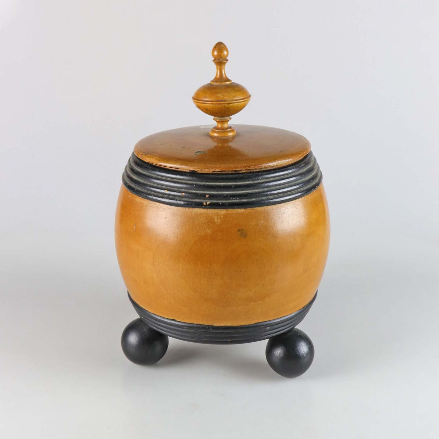 Tobakstønde fra år 1890 i Lakeret bøgetræ. Kugler som fødder og spir på låget