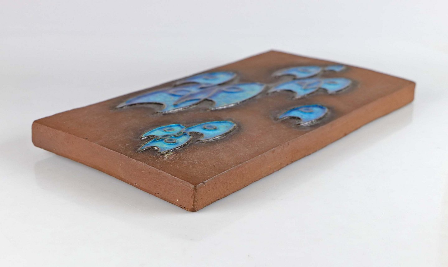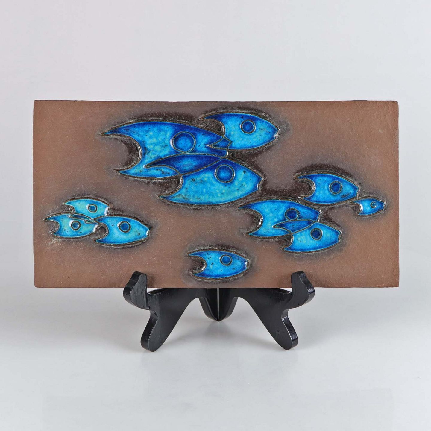 Relief af stentøj dekoreret med stime af blå fisk. No 933/829