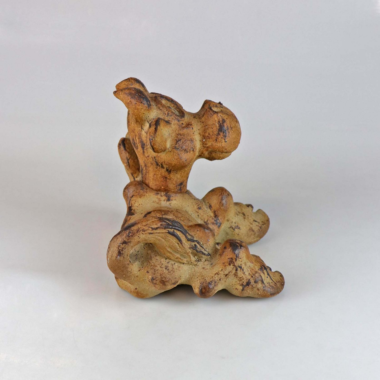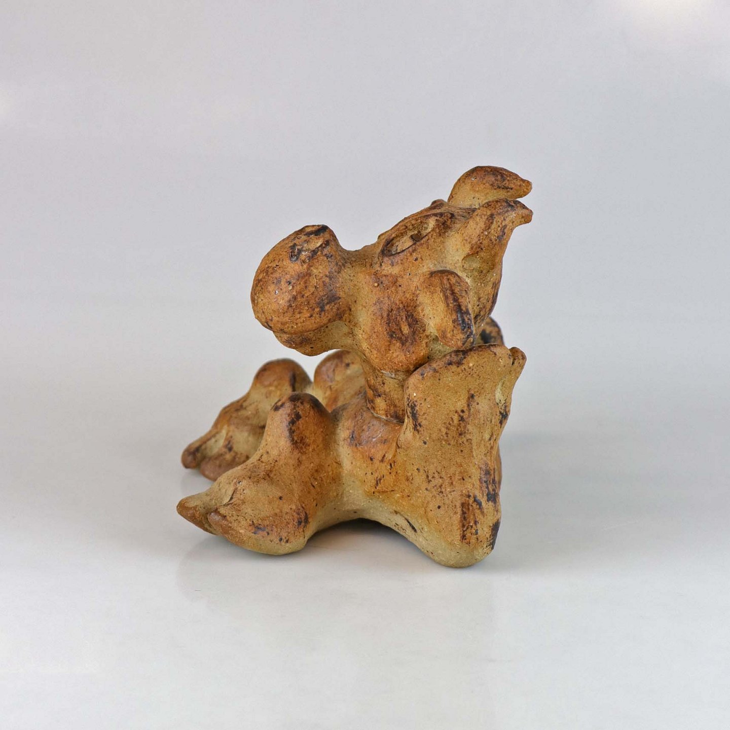 Figur af keramik der forestiller en liggende ko. Hovedet kan tages af