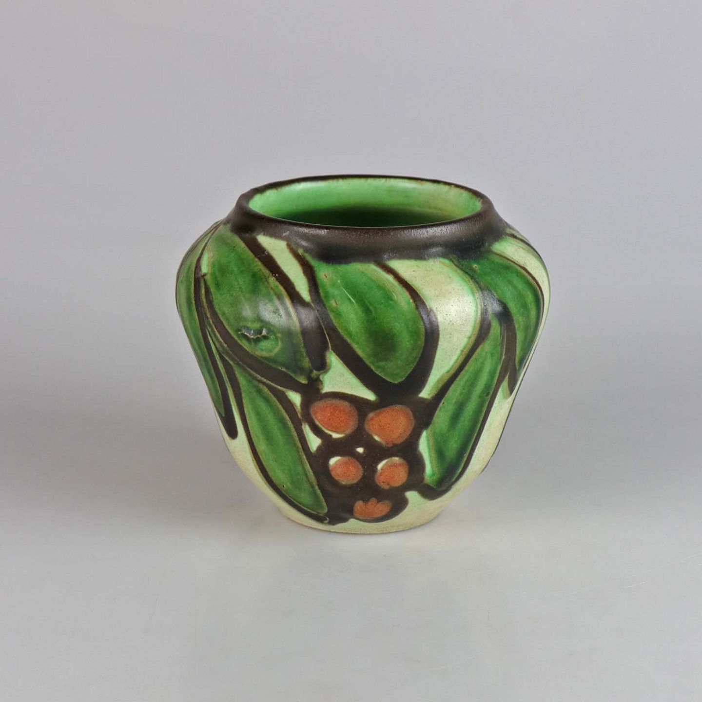 Vase af keramik med mat glasur. Dekoreret med grønne blade og brunlige bær