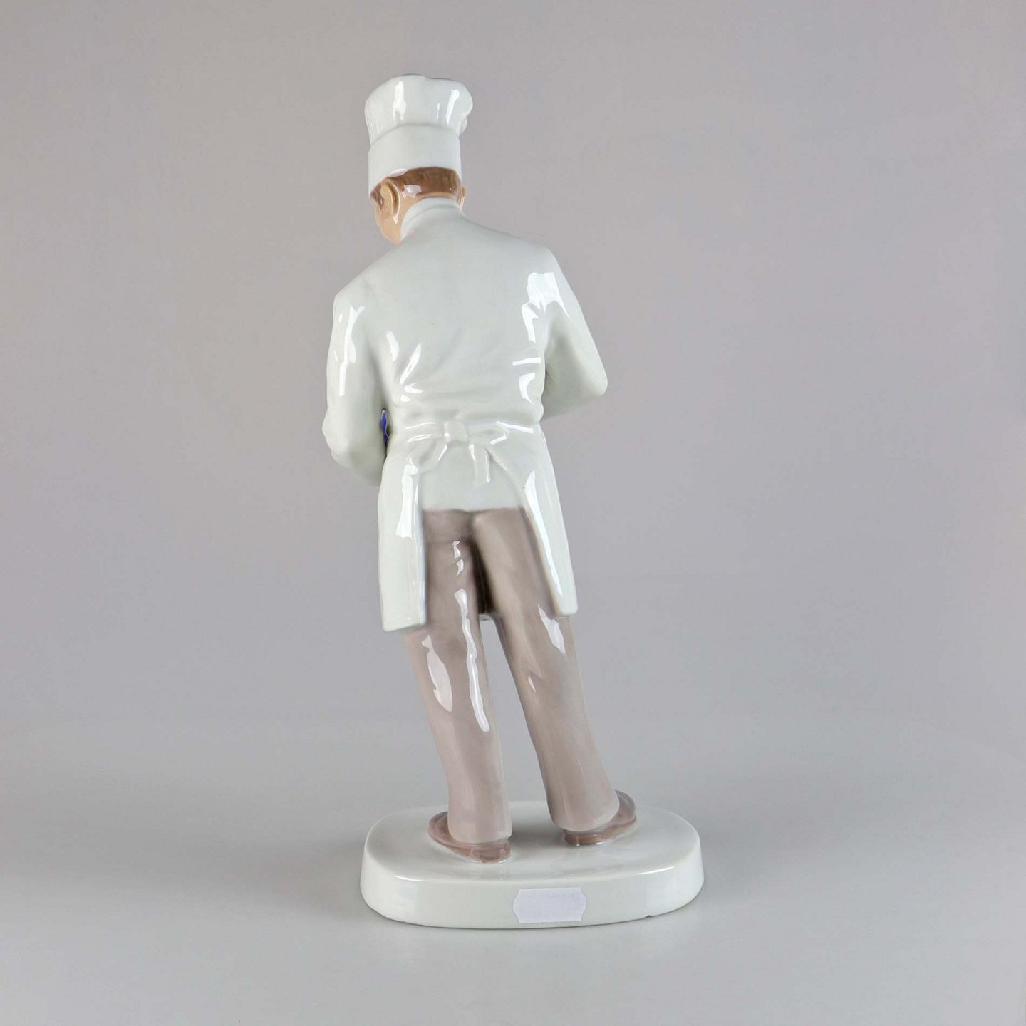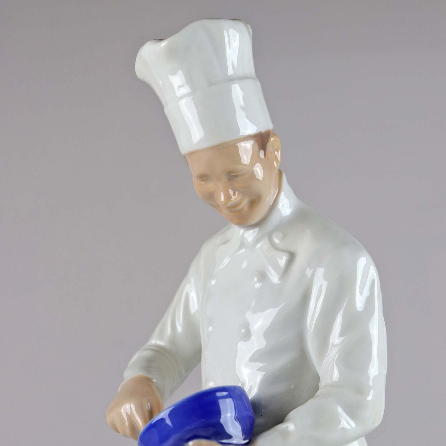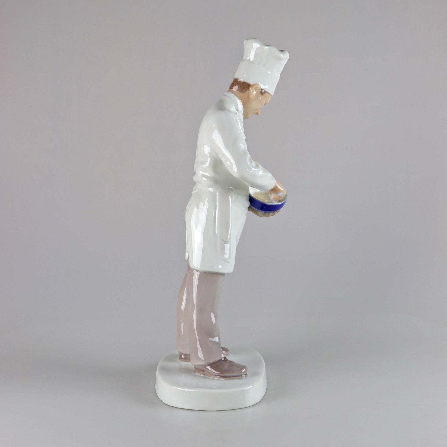 Figur i porcelæn af en kok med høj hue og en skål i hænderne