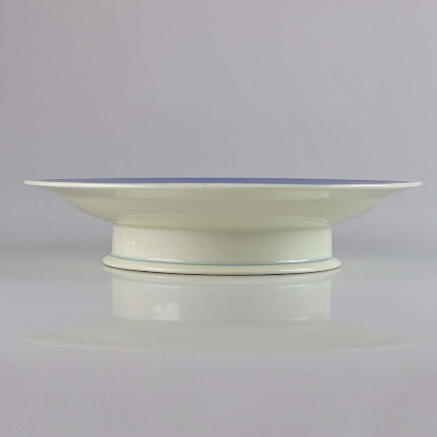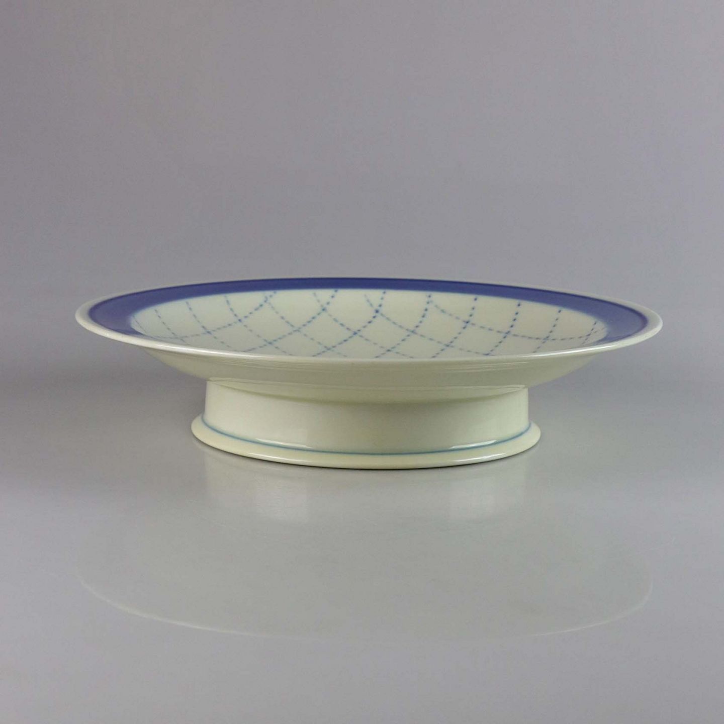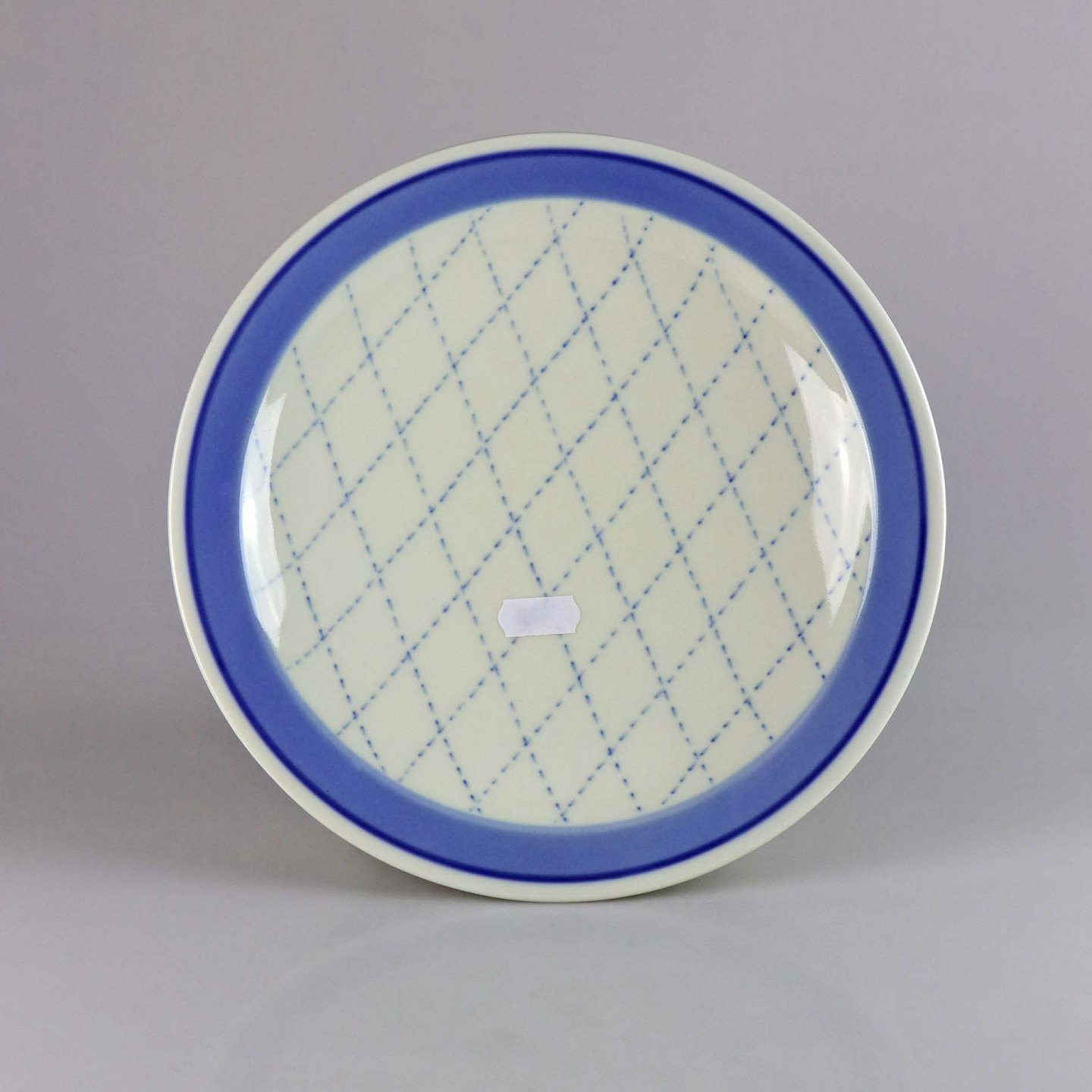 Cremefarvet med harlekin mønstre af blå prikker og blå kant