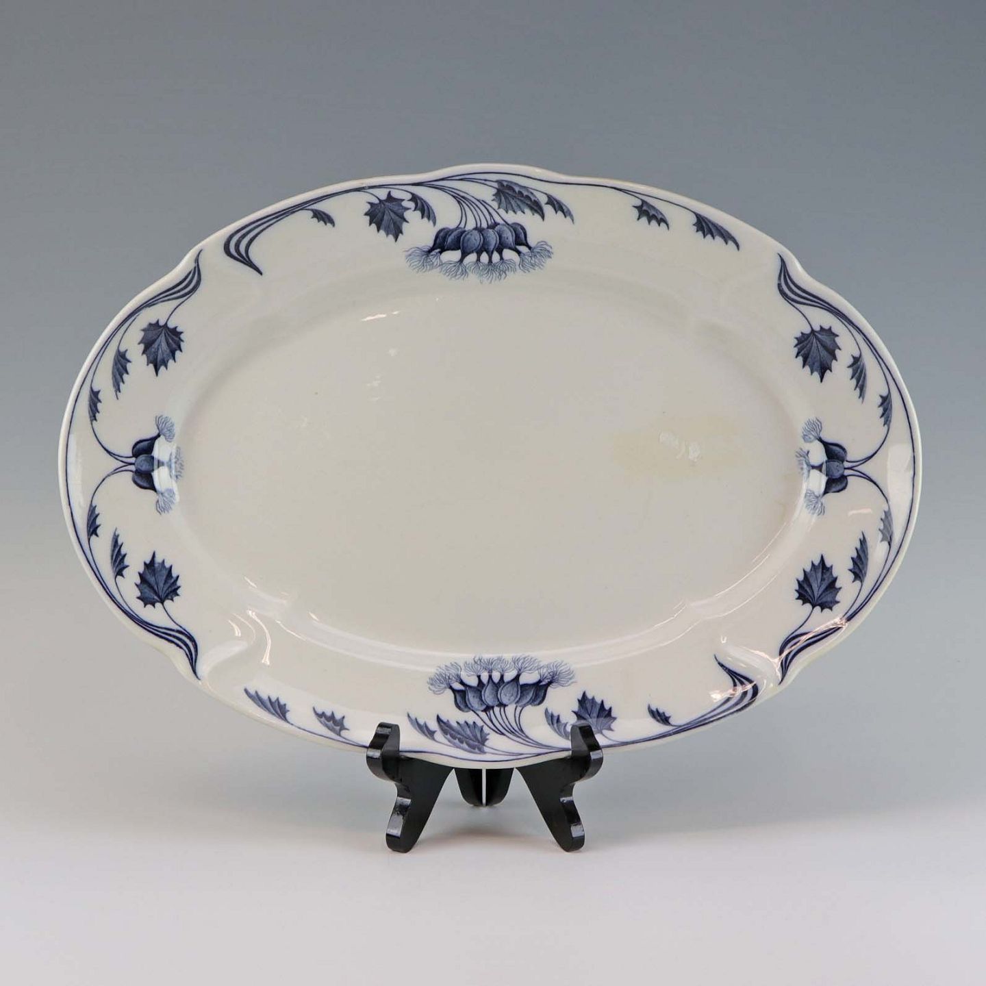 Stellet Tidsel er tysk og er lavet i fajance. Stellet er hvidt og dekoreret med en ranke af blade og tidsler i grå blå farver