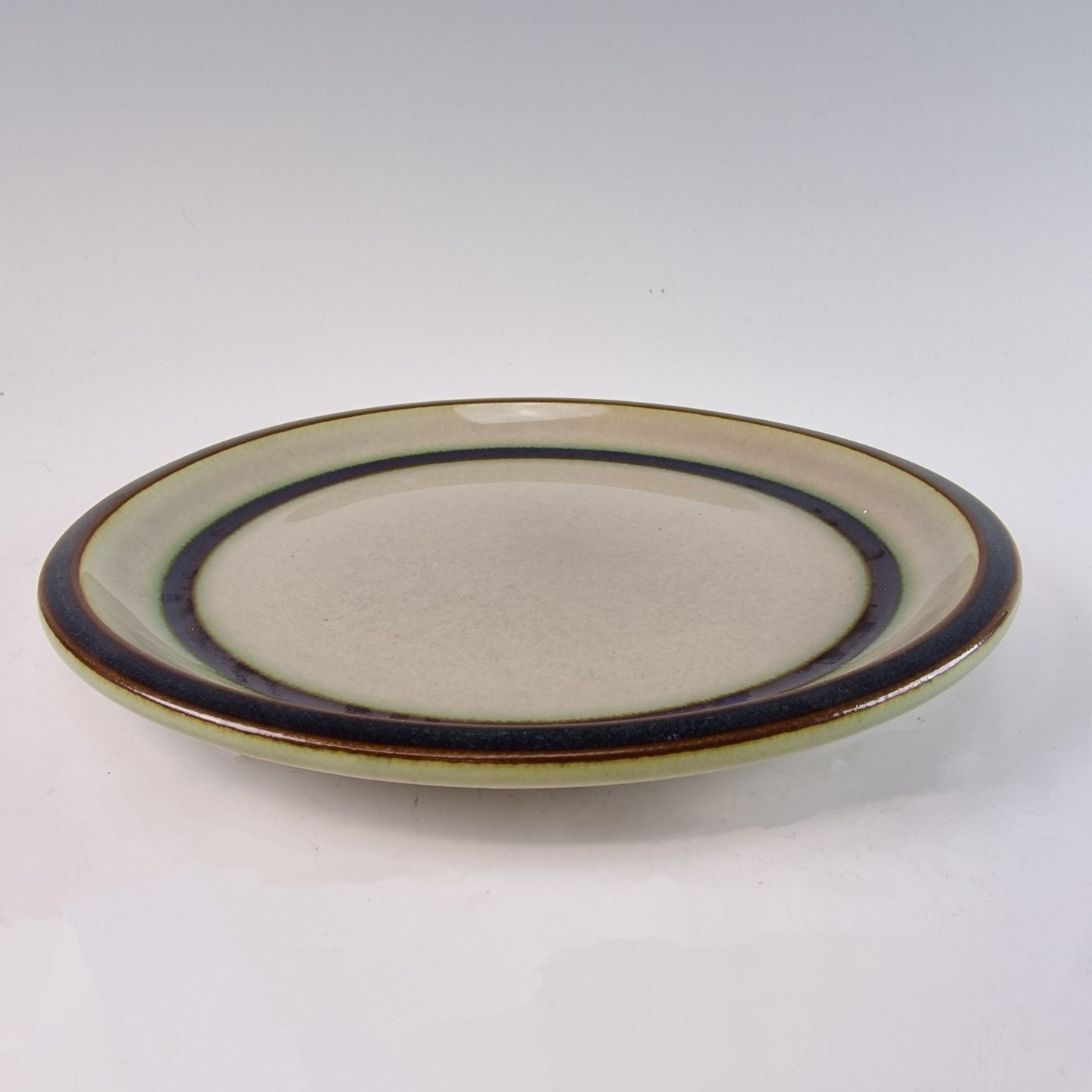 Stellet Tema er af stentøj, glaseret med lys grå og dekoreret med kanter af grønne og brune farver