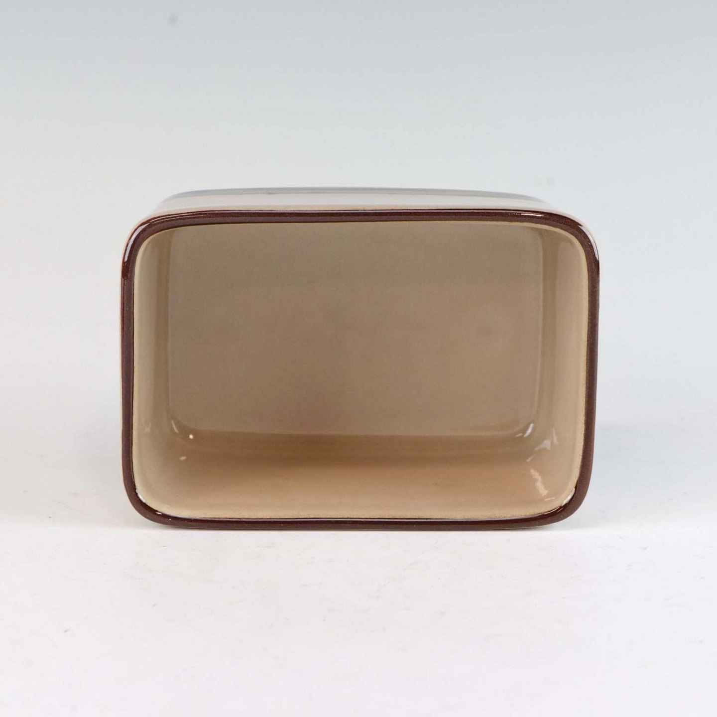 Stellet Peru er af stentøj, glaseret med lys grå farve og dekoreret med bånd af grøn/brunlige farve