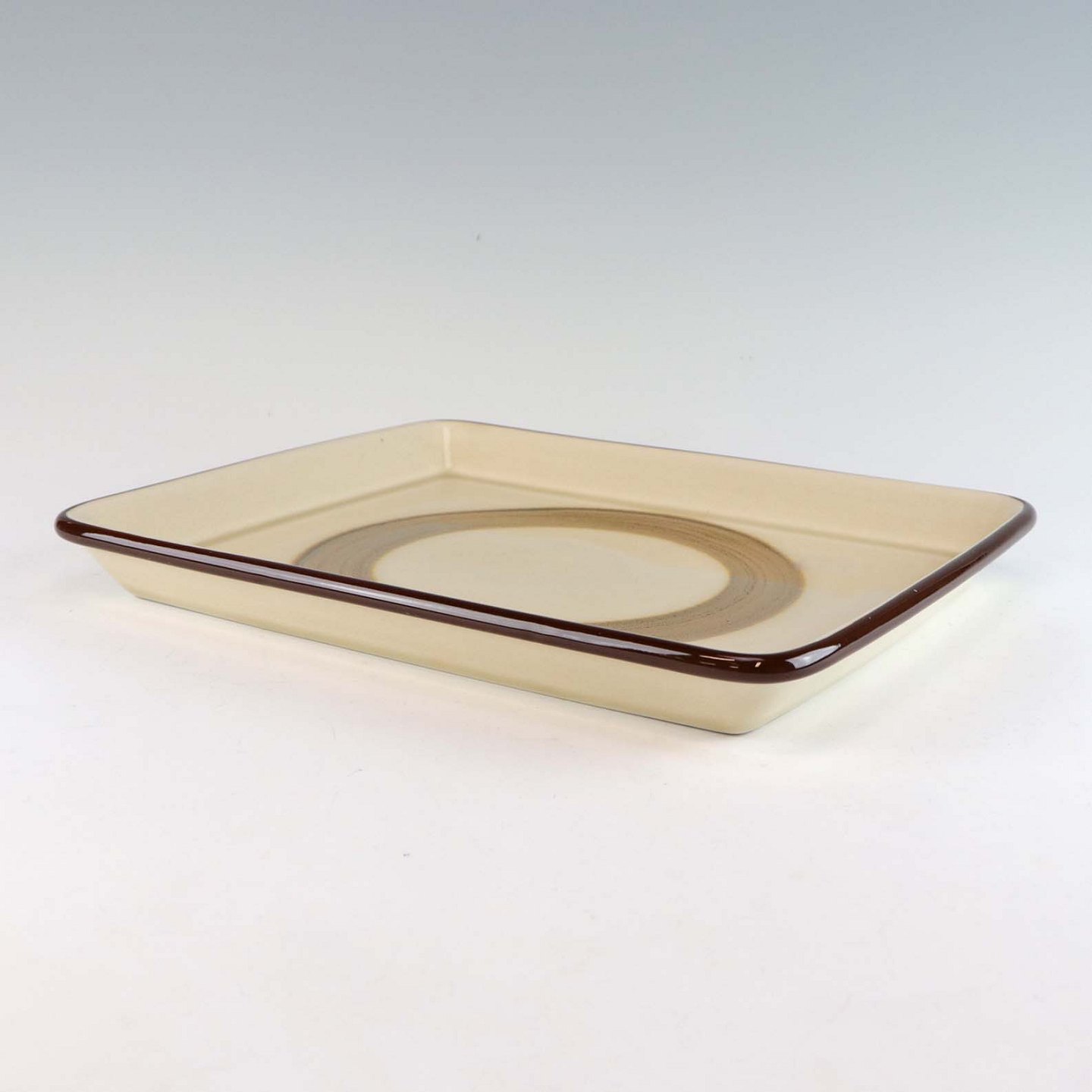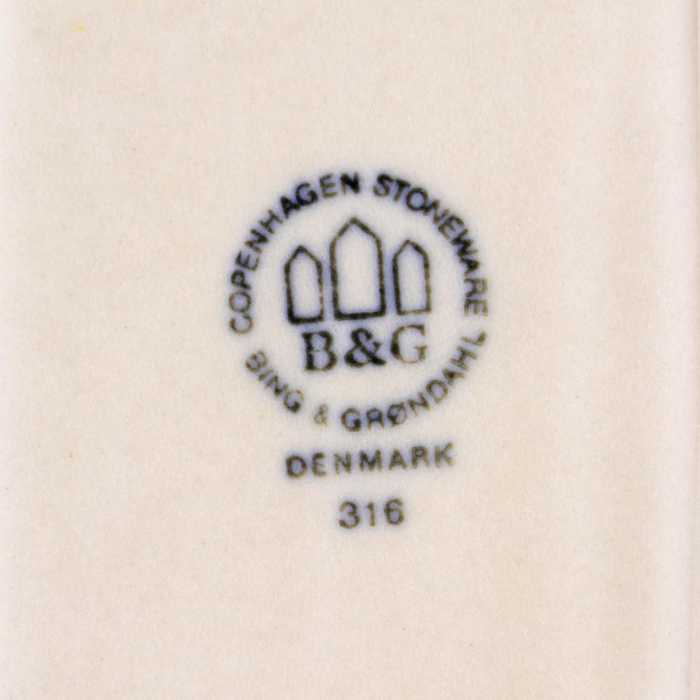 Stellet Peru er af stentøj, glaseret med lys grå farve og dekoreret med bånd af grøn/brunlige farve