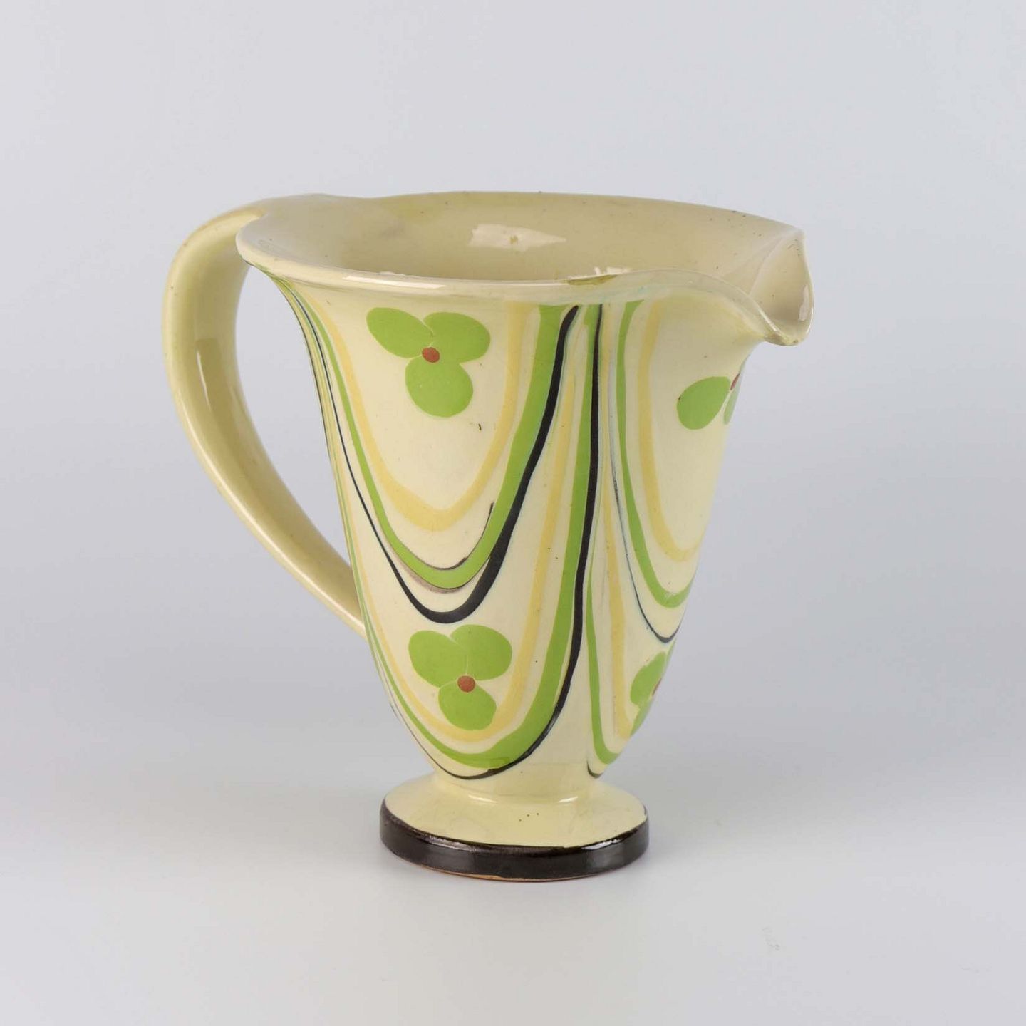 Kande af keramik i beige med mønstre i gul og grønne farver
