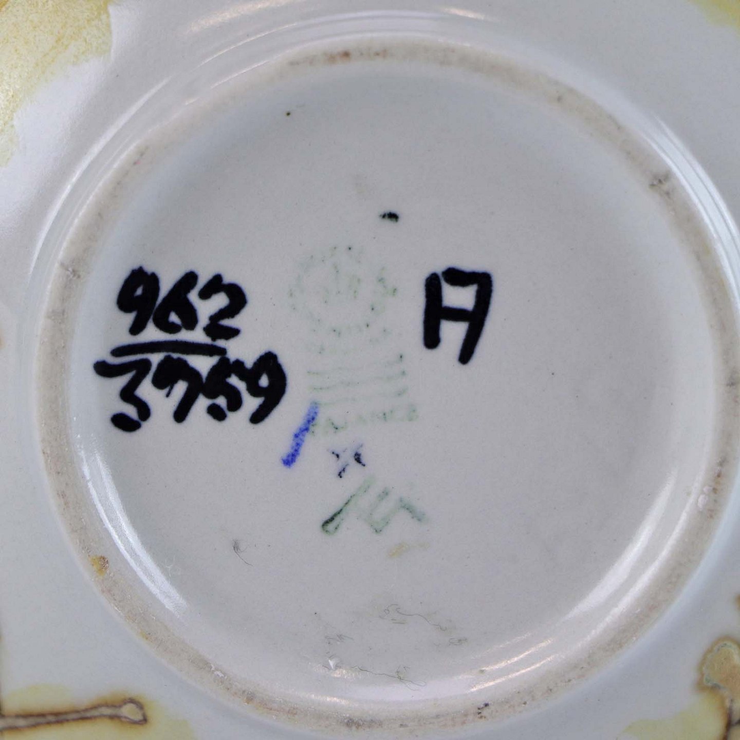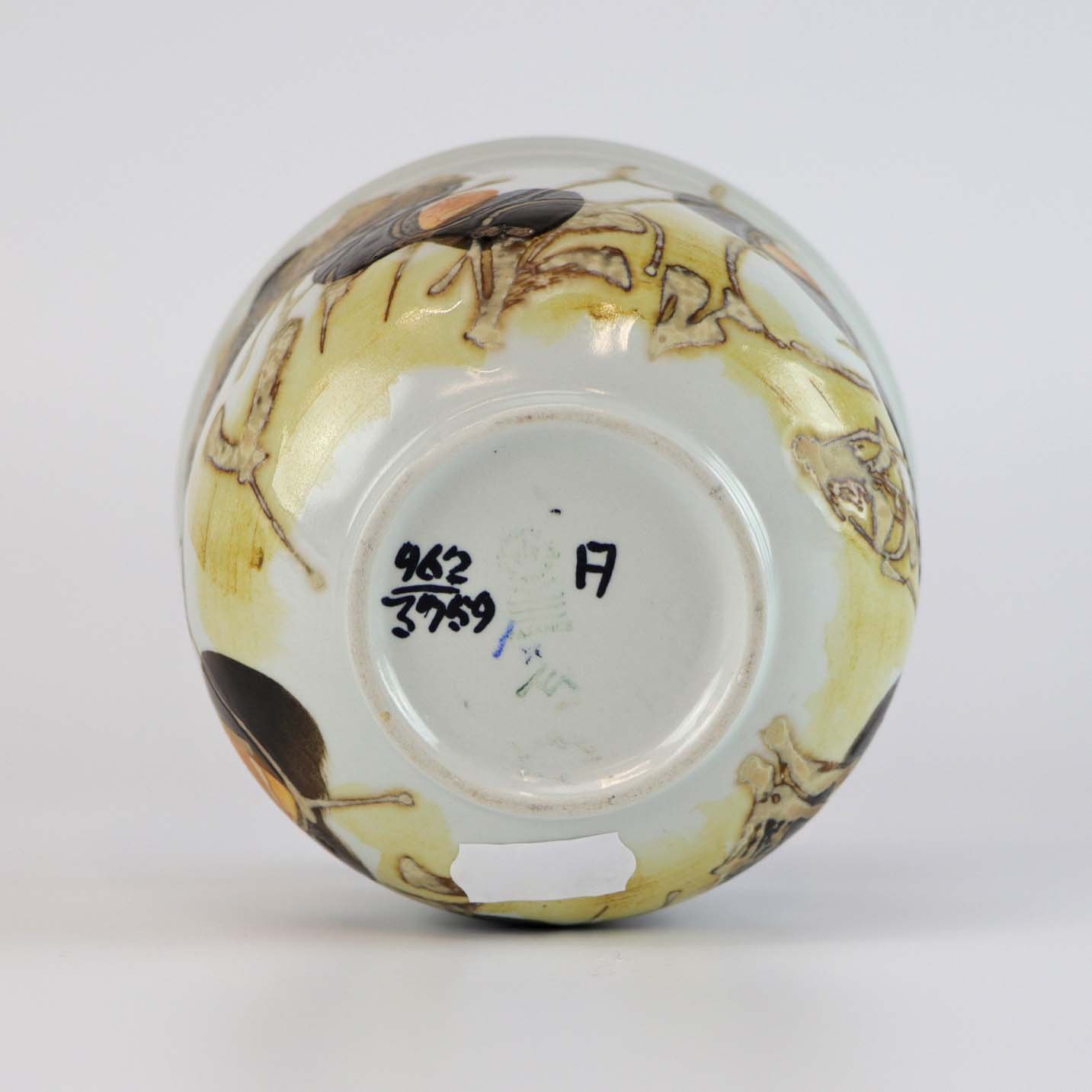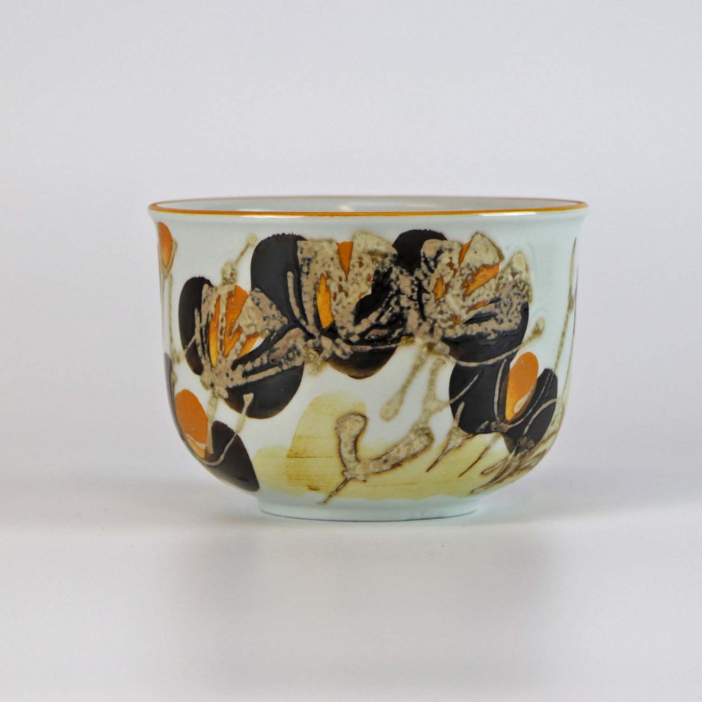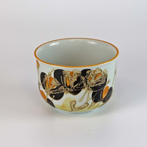 Urtepotteskjuler af fajance, glaseret med hvid og dekoreret med gyldne og brune nuancer. No 962/3759