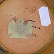 Skål eller fad af stentøj med rødbrune farver og orange brune nuancer