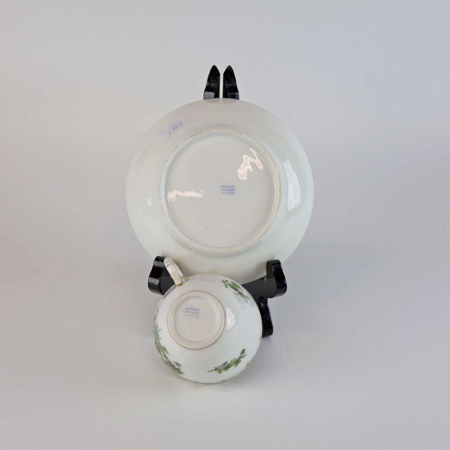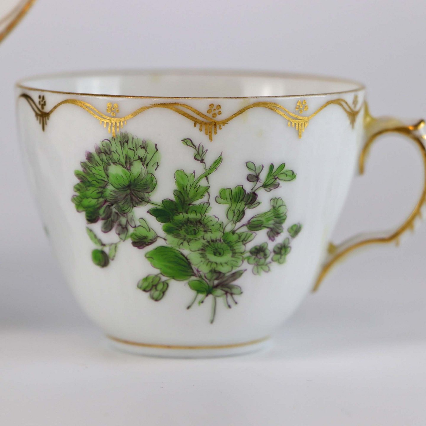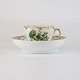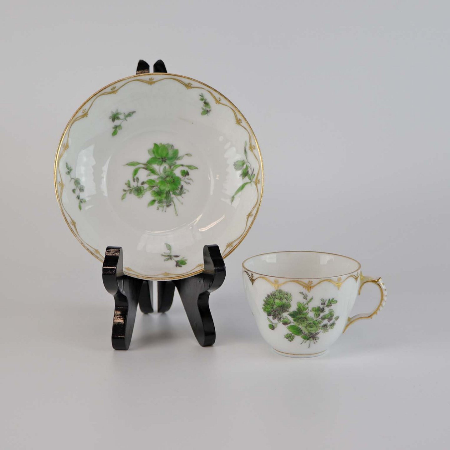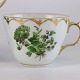 Antik kop og underkop i svejfet hvidt porcelæn med motiv af grønne blomster og blade