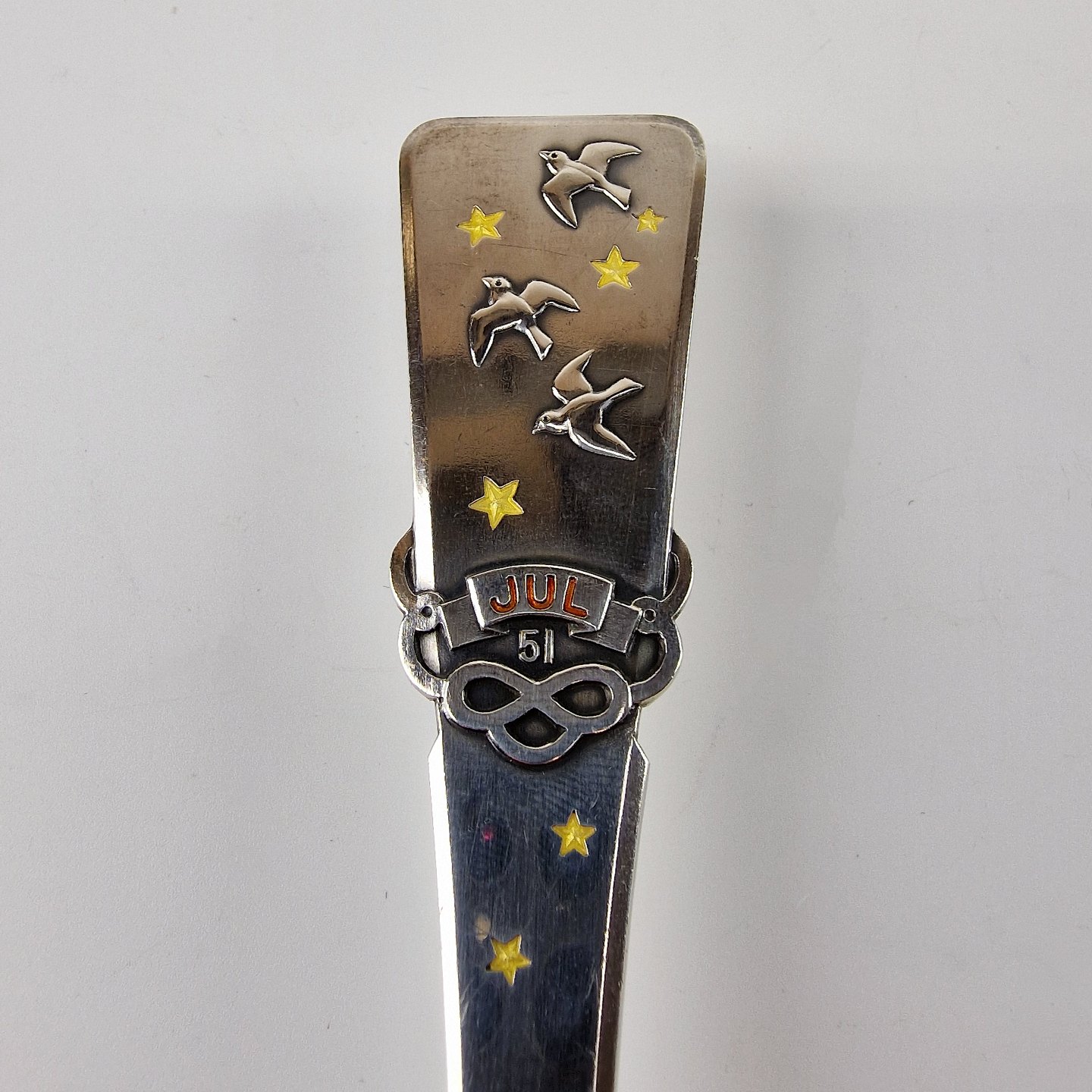 Tretårnet sølv ske. Mærket Jul 51. Motiv med fugle og stjerner