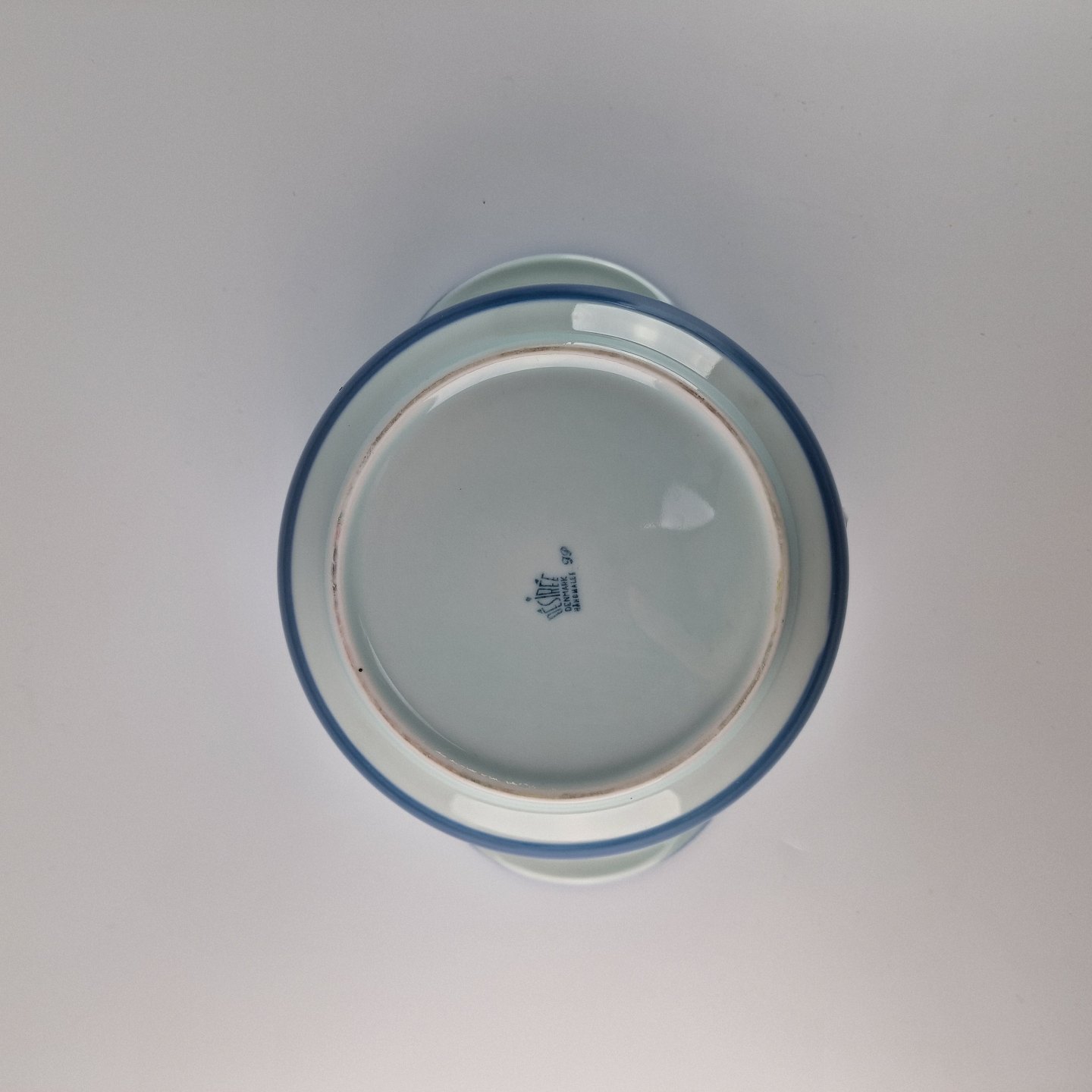 Stellets runde former er dækket med en silkeblød glasur og håndmalet med er lys almueblå farve lagt under glasuren. Stellet er ovnfast