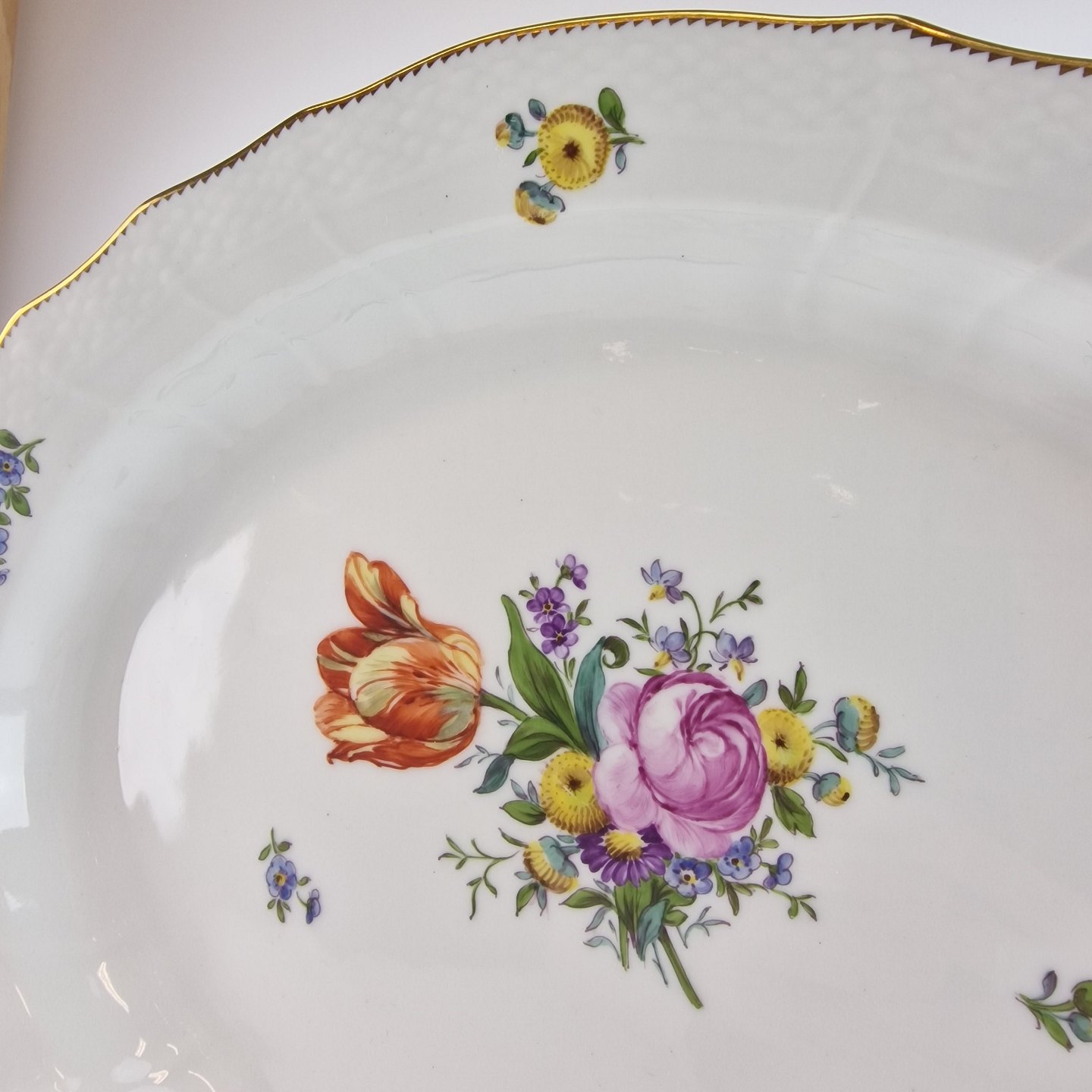 Saksisk blomst er dekoreret med farverige blomsterbuketter og guldkant.