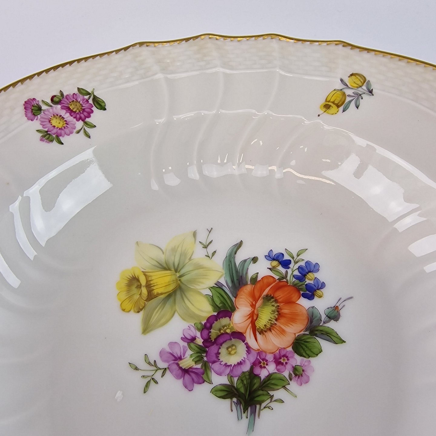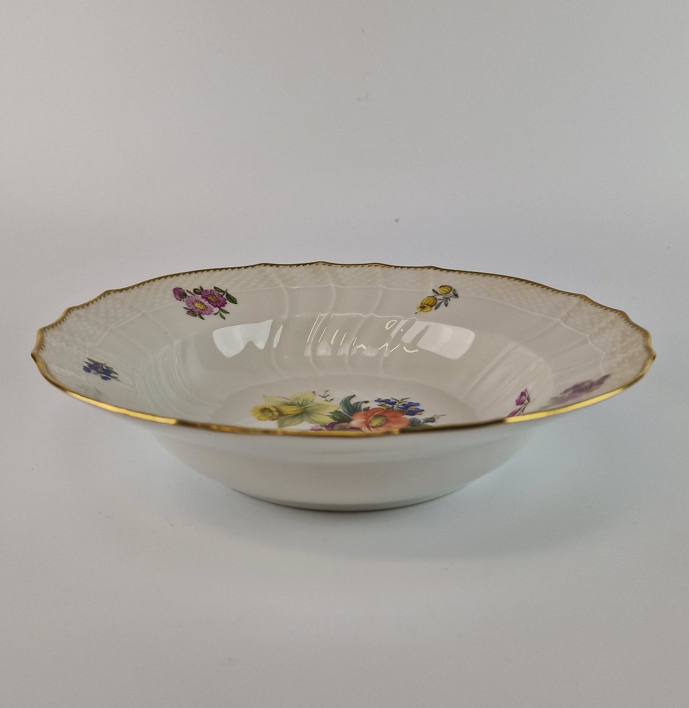 Saksisk blomst er dekoreret med farverige blomsterbuketter og guldkant.